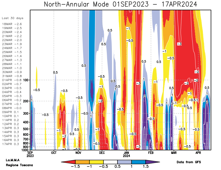 L’AAM aura été positive tout le mois avec un afflux EAMT+ marqué courant du mois ce qui a certainement favorisé une dynamique perturbée aux latitudes moyennes notamment sud-ouest des USA et Europe de l’ouest. Cette AAM+ aura certainement eu une influence sur les géopotentiels plus élevés que la moyenne sur les hautes latitudes. Le décalage de la MJO sur l’hémisphère occidental aura aussi favorisé cette AAM+ et ces géopotentiels plus élevés aux hautes latitudes avec un dernier sursaut d’El Nino à la clé.