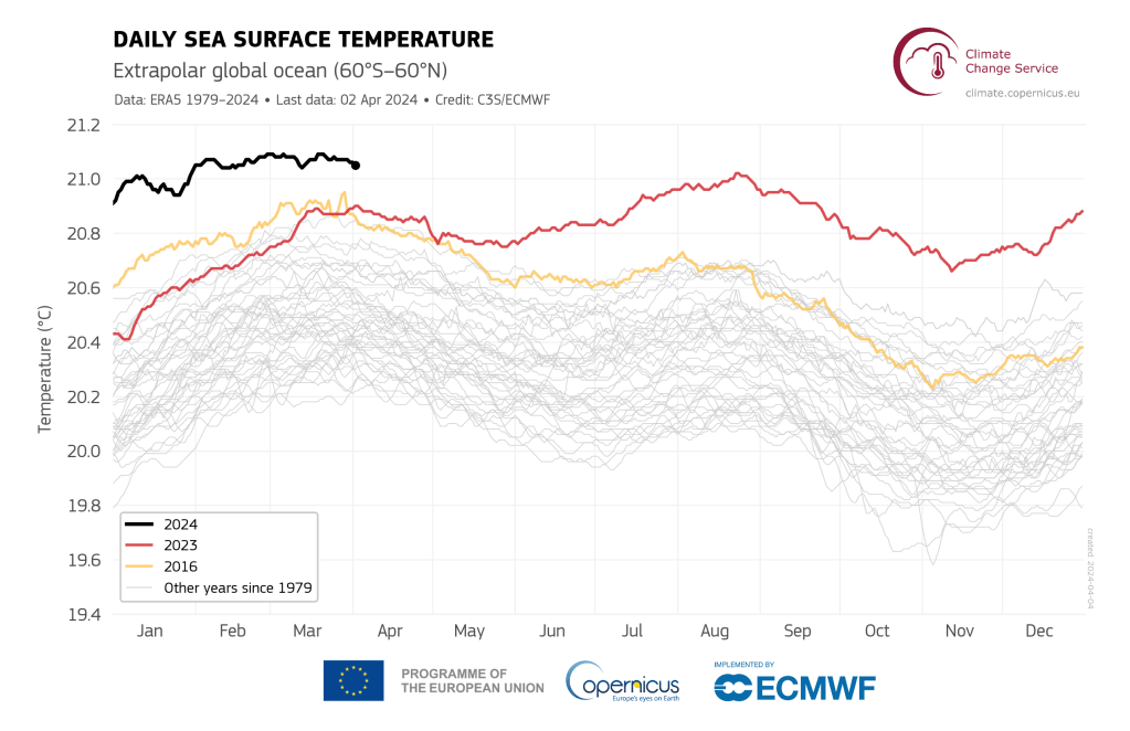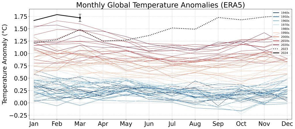 La température moyenne mondiale des douze derniers mois (avril 2023 – mars 2024) est la plus élevée jamais enregistrée, à 0,70°C au-dessus de la moyenne 1991-2020 et 1,58°C au-dessus de la moyenne préindustrielle 1850-1900.