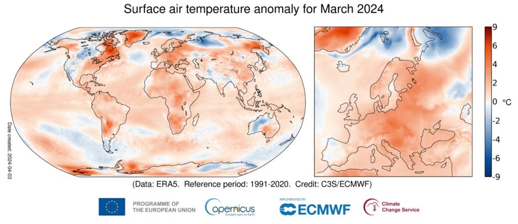 La température moyenne européenne pour mars 2024 était de 2,12 °C supérieure à la moyenne de mars 1991-2020, faisant de ce mois le deuxième mois de mars le plus chaud jamais enregistré sur le continent, avec seulement 0,02 °C de moins qu’en mars 2014. Les températures étaient les plus supérieures à la moyenne en mars 2024. régions du centre et de l’est.