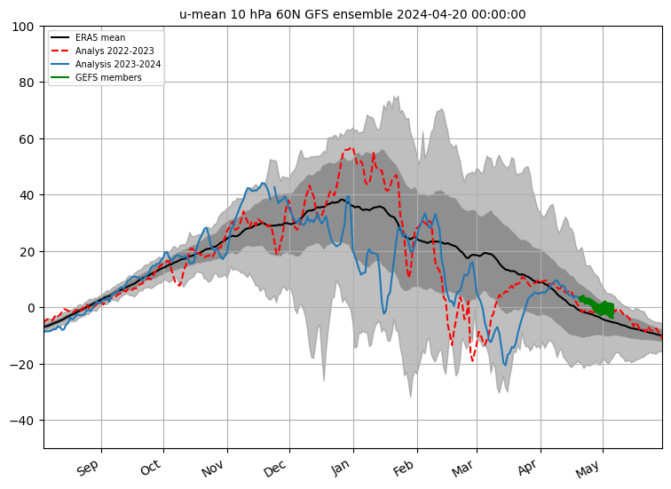 Un réchauffement majeur stratosphérique s’est opéré le 4 mars avec renversement des vents zonaux à 10 hPa. Une reprise des vents zonaux a été observé dès le 26 mars mais à une vitesse relativement limitée.