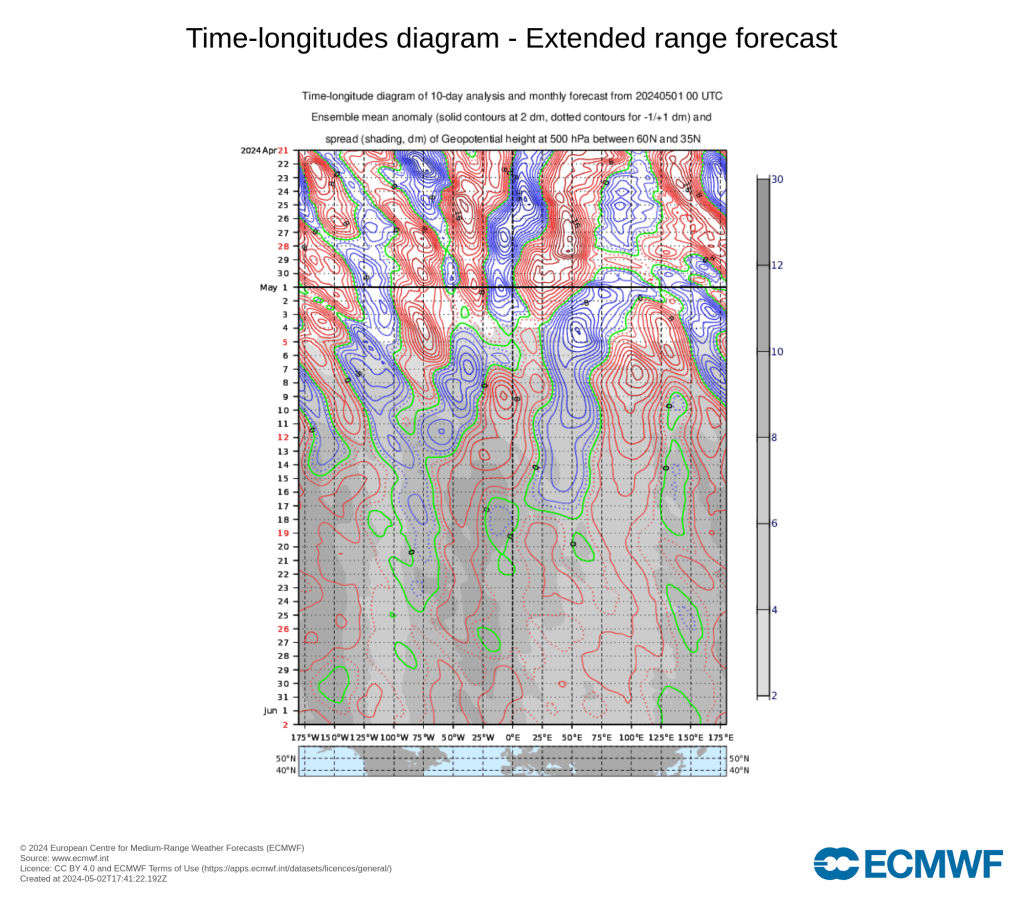 MJO phases 4-5 assez faiblement opérante, le tout dans un El Nino se terminant, favorisent tout de même le retour de conditions plus anticycloniques vers l’Ascension mais des hauts géopotentiels rétrogrades vers l’Atlantique la semaine du 13 mai.