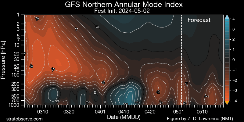 Autre indicateur, la tendance à la baisse de l’AAM avec une EAMT- actuelle en mode GWO 1 – 2, est favorable à une activité orageuse et tornadique au dessus de la moyenne aux USA et à un temps instable en Europe de l’ouest.