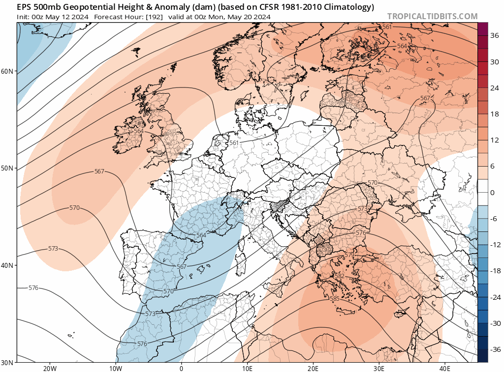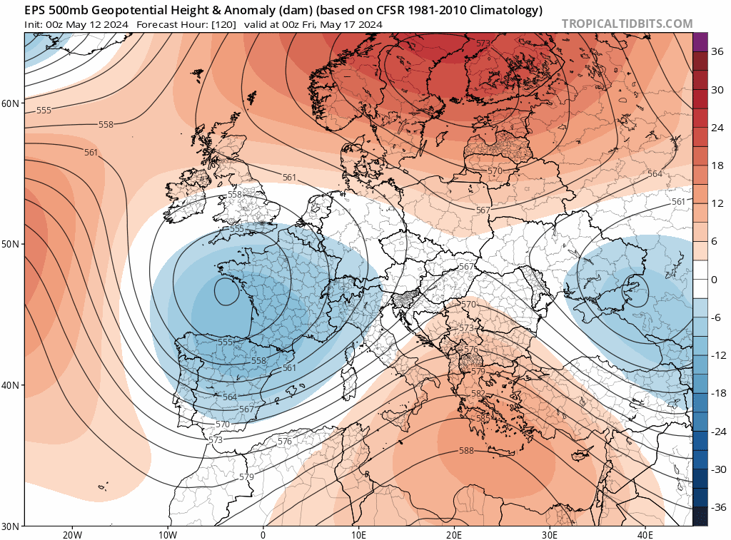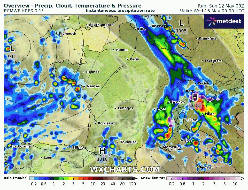 Statu quo avec une goutte froide qui serait complètement bloqué sur le pays. Avec cet air froid d’altitude et après les éclaircies matinales, les averses et orages se multiplieront une nouvelle fois quasiment en toute région, avec toujours un risque de grêle. Le pourtour méditerranéen et la Corse resteront à l’écart avec un petit risque d’ondées.