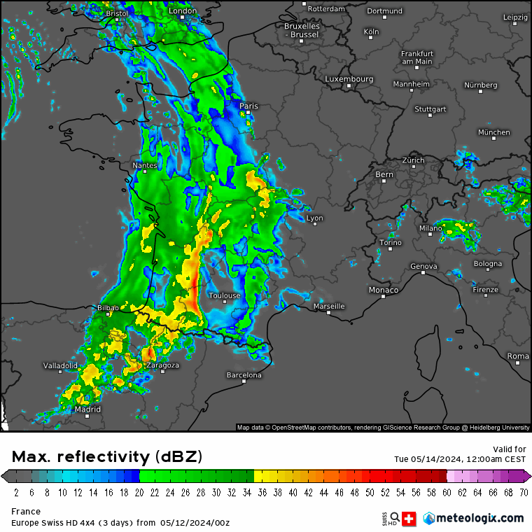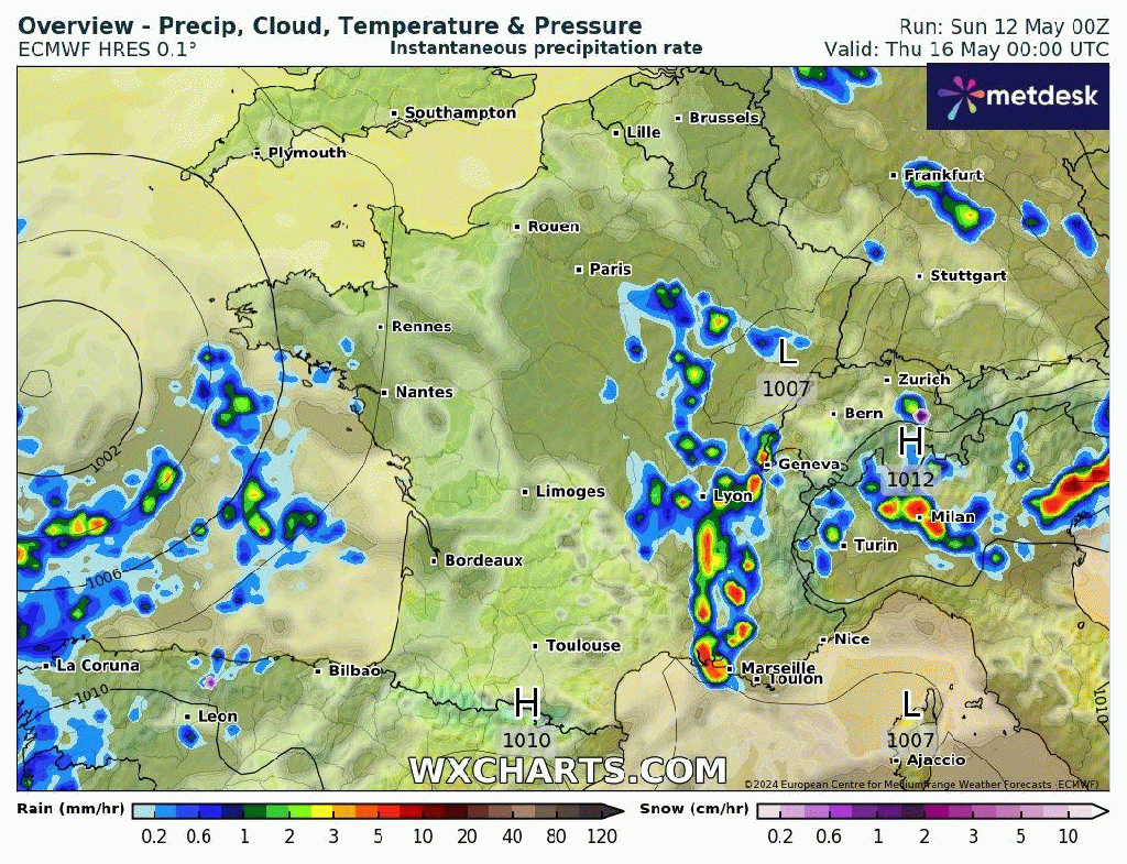 Le front froid bien pluvieux continuera à traverser le pays d’ouest en est. De bonnes pluies possibles également sur les Cévennes sont attendues.