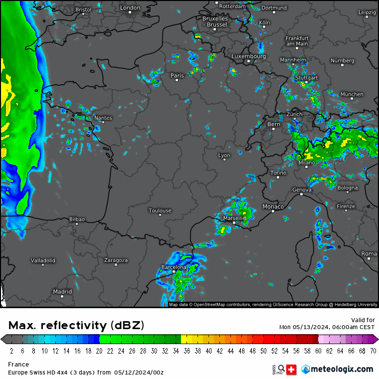 Après des éclaircies matinales, les averses et les orages tendront à se multiplier sur toutes les régions hormis le pourtour méditerranéen et la Corse. Ces averses et orages pourront donner de la grêle de taille modeste. Le nord de la Seine semblerait plus à l’écart avec un risque d’averses moins important.