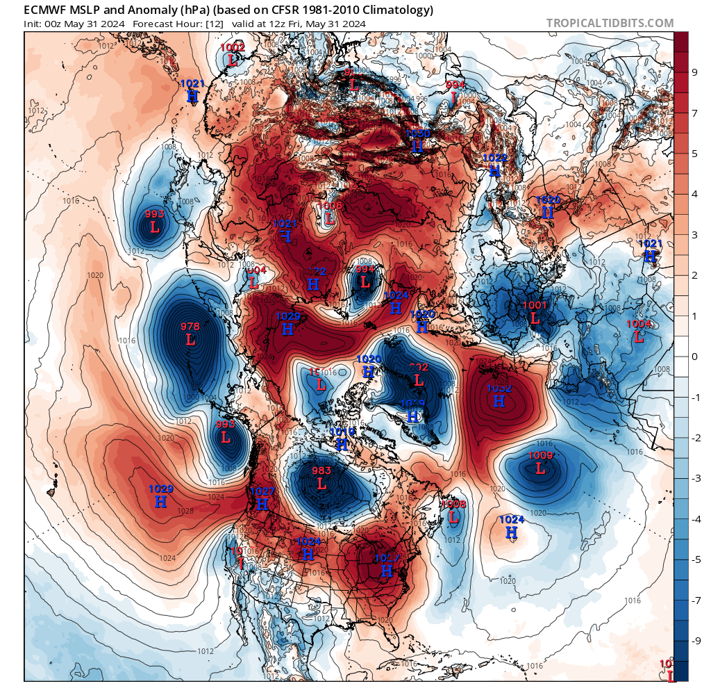 . Anomalie chaude sur USA sauf moitié est hors Floride et côte est, et extrême nord-ouest. Anomalie chaude Saskatchewan, Manitoba et Nunavut. Anomalie froide ailleurs au Canada. Anomalie chaude Alaska.