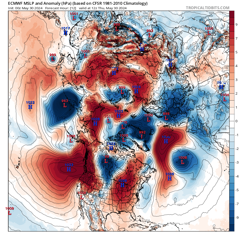 . Hautes pressions USA sauf sud/sud-ouest. Hautes pressions Canada sauf centre et extrême nord-est. Hautes pressions Alaska. Bas géopotentiels sud Alaska, hauts géopotentiels nord Alaska. Hauts géopotentiels Canada sauf ouest, est/sud-est et extrême nord. Hauts géopotentiels USA sauf petite moitié est et extrême nord/nord-ouest
