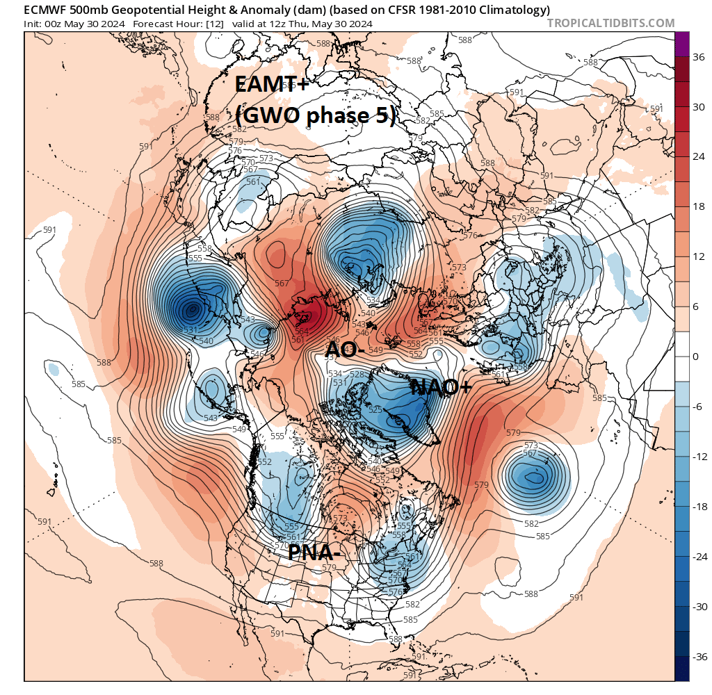 . PNA- (hauts géopotentiels/hautes pressions au large des Aléoutiennes – bas géopotentiels /basses pressions dominantes descendant sur les Rocheuses)