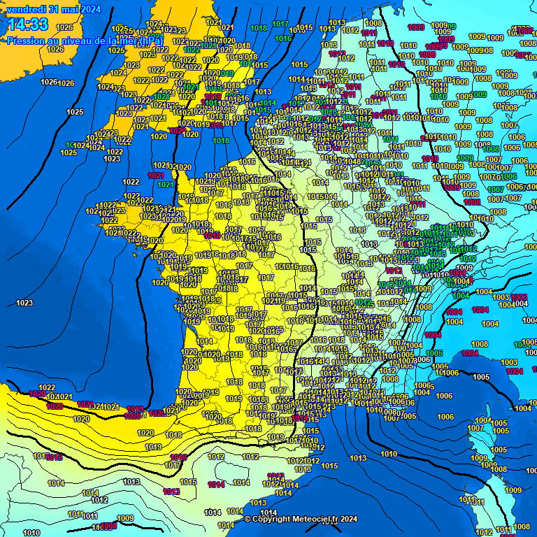 . Un flux de nord instable est installé sur le pays avec de l’air froid d’altitude circulant en direction de l’Italie. Une petite goutte froide parallèlement circule du nord au Massif Central réactivant l’instabilité. Les averses parfois gréligènes et/ou orageuses se multipliant du nord au centre, ainsi que du centre-est au nord-est. On notera une petite frontale pluvieuse plus organisée qui descend des Hauts de France vers la Haute Normandie et l’Ile de France. Soleil plus présent sous un ciel variable sur une petite moitié ouest. Bel ensoleillement sur le pourtour méditerranéen et en Corse.
