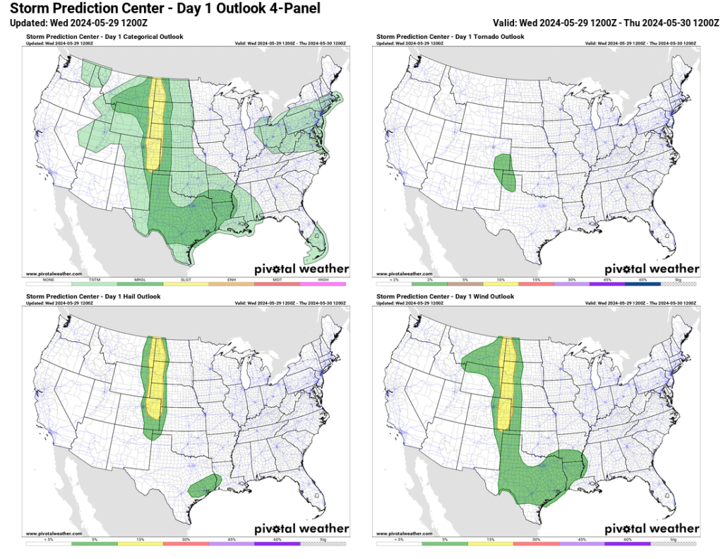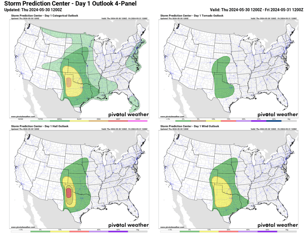 Risque d’orages violents à venir sur l’ouest du Texas notamment. Risque de grosse grêle bien présent et petit risque tornadique évalué à 2%.