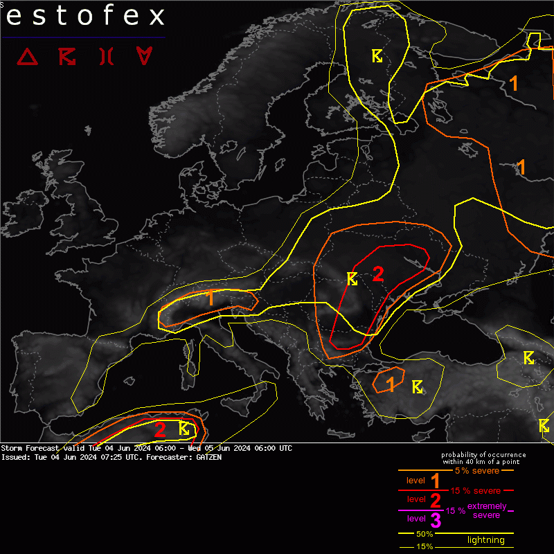 Orages parfois violents de nouveau attendus dans l’Europe du sud-est avec un fort caractère gréligène possible ainsi qu’en Ukraine.