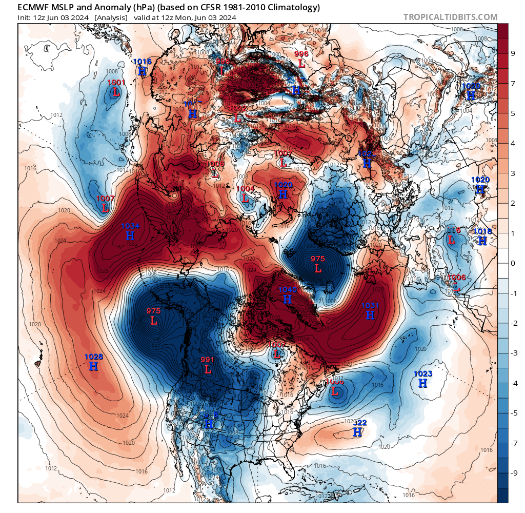 . Basses pressions USA. Basses pressions Canada sauf façade est et nord. Basses pressions Alaska. Bas géopotentiels Alaska. Hauts géopotentiels Canada sauf moitié ouest. Hauts géopotentiels USA sauf extrême nord/nord-ouest et vers les plaines centrales.