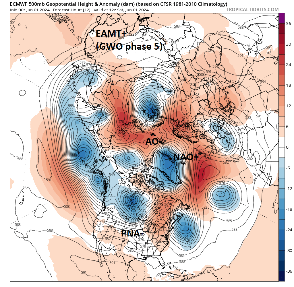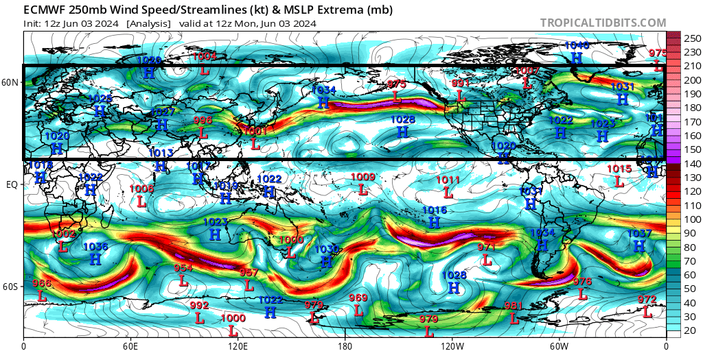 . Schéma plus zonal que précédemment à l’échelle hémisphérique. Courant jet se renforce sur le Pacifique nord avec une extension jusqu’à la côte ouest américaine. C’est le résultat de la chaleur tropicale amené par Ewiniar boostant le courant jet + la précédente EAMT+ sur l’est asiatique. Cela renforce les contrastes entre les 2 masses d’air polaire et subtropicale.