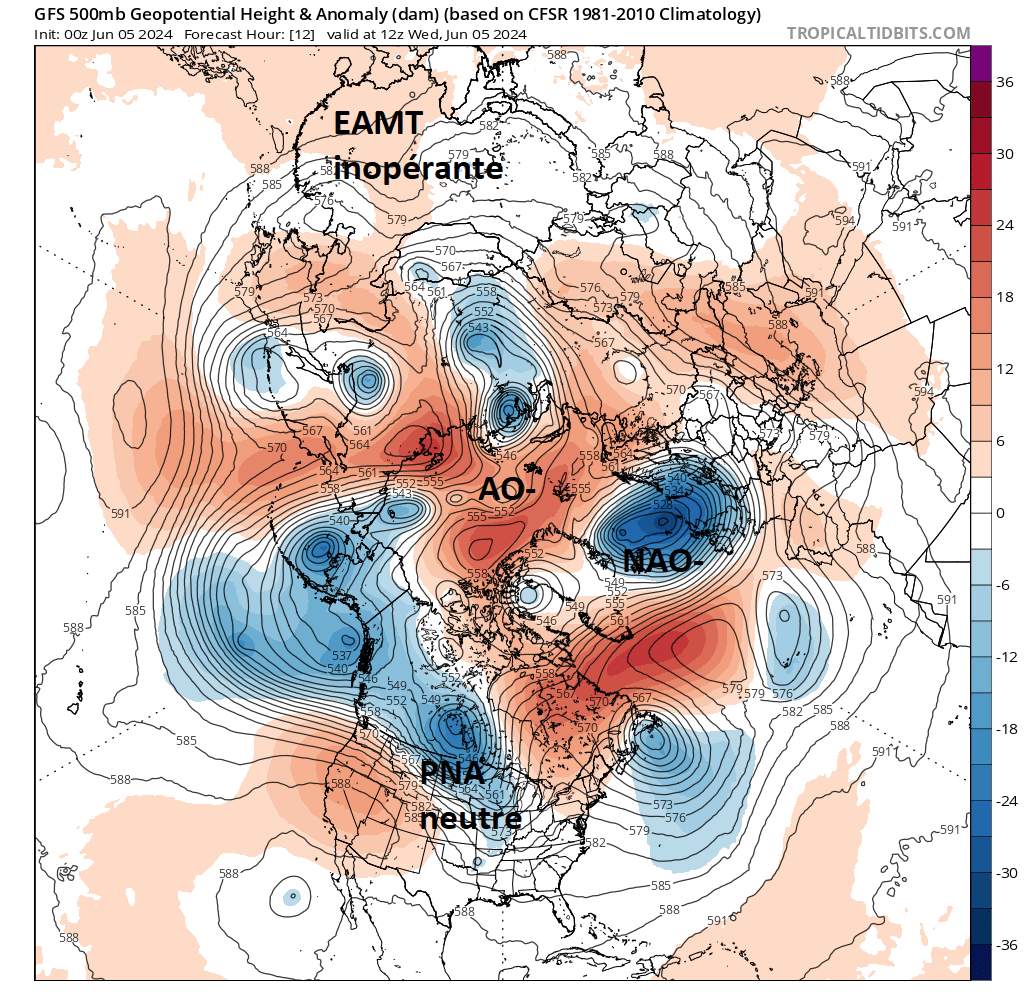 Anomalies de géopotentiels : hauts géopotentiels en orange-rouge / bas géopotentiels en bleus