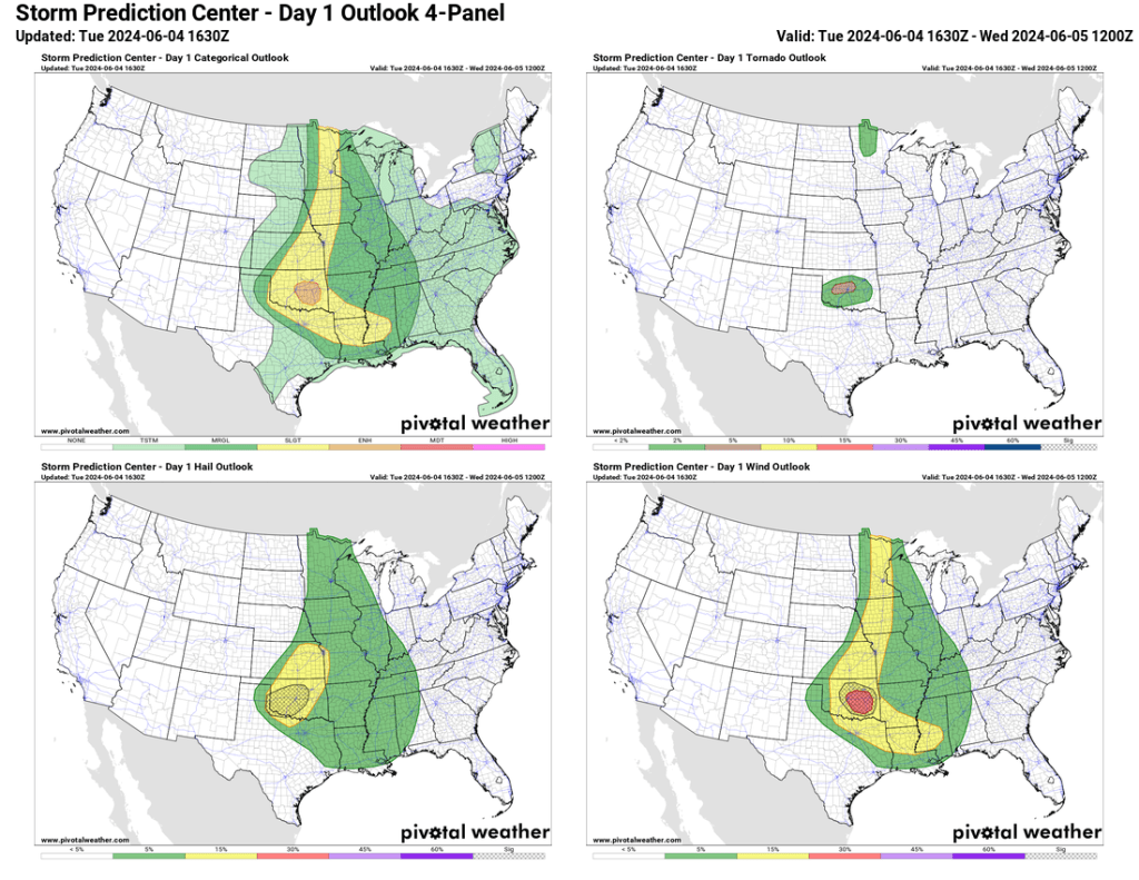 Risque d’orages violents dans quelques heures de l’ouest du Texas au Nebraska. Petit risque de tornades du Dakota du sud au Kansas, ainsi que sur le sud-ouest du Texas.