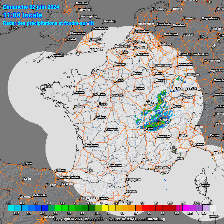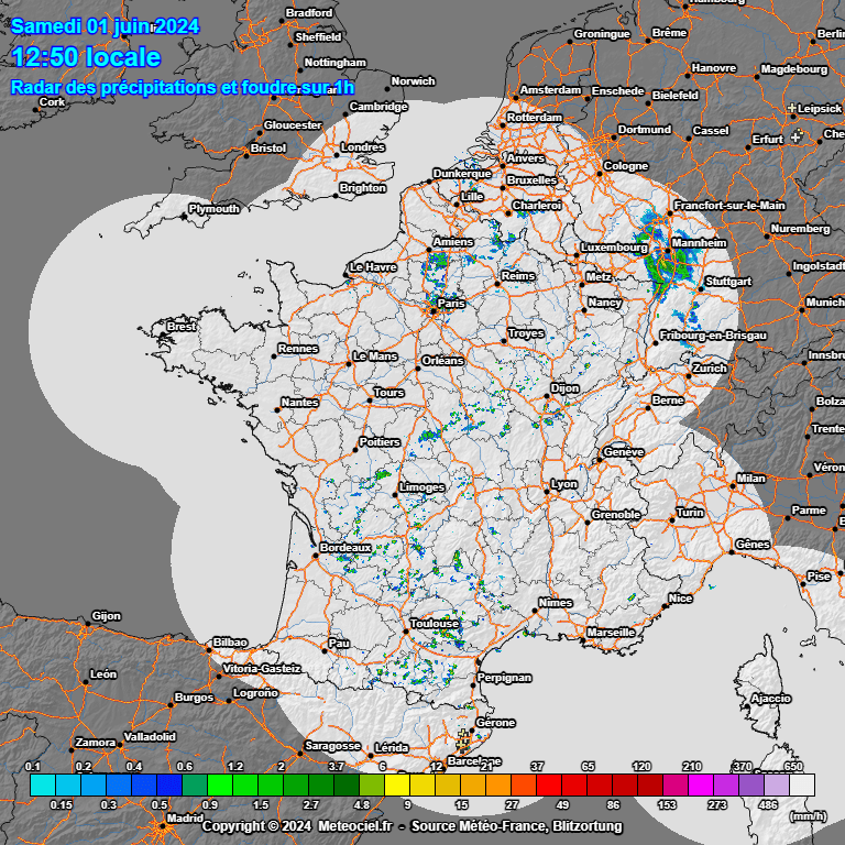 . Une dorsale anticyclonique s’installe sur le pays mais plus particulièrement au sud de la Loire. Au nord de la Loire, un petit front froid en pleine frontolyse s’est infiltré donnant des cumulus et des stratocumulus, et un ciel souvent encombré. Quelques faibles pluies éparses et bruines sont signalées localement. Au sud de la Loire, ciel souvent très ensoleillé malgré quelques cumulus et éventuellement quelques entrées maritimes près des littoraux méditerranéens. Un risque d’orages apparaitra dans l’après-midi sur l’est des Pyrénées.