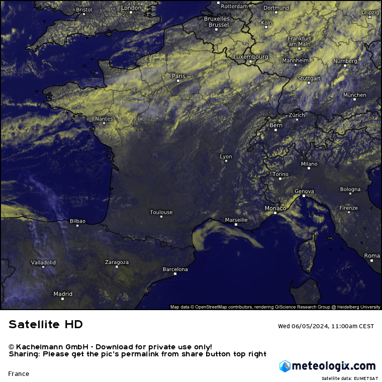. Une goutte froide d’altitude circule sur le sud du pays entre entre Massif Central, PACA et Occitanie. Au fil des heures avec le resserrement des gradients thermiques verticaux, des averses et des orages peuvent se développer avec éventuellement un peu de petite grêle. Le risque d’orages sera surtout présent du sud du Massif Central au sud des Alpes. Sur la moitié nord en provenance de la mer du nord, une petite onde chaude circule pouvant donner de faibles pluies et des bruines. On voit à l’image sat que cette onde chaude circule notamment au nord de la Seine. Soleil plus présent sur le pourtour méditerranéen et la Corse.