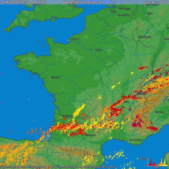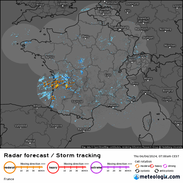 Le week-end du 8-9 juin s’annonce bien orageux du sud-ouest au centre-est avec parfois des phénomènes forts à redouter, ainsi que des pluies orageuses localement diluviennes (notamment dans le sud-ouest. Temps plus agréable au nord de la Loire. Les orages gagneront le sud-est dimanche. Températures en baisse de nouveau à partir de dimanche.