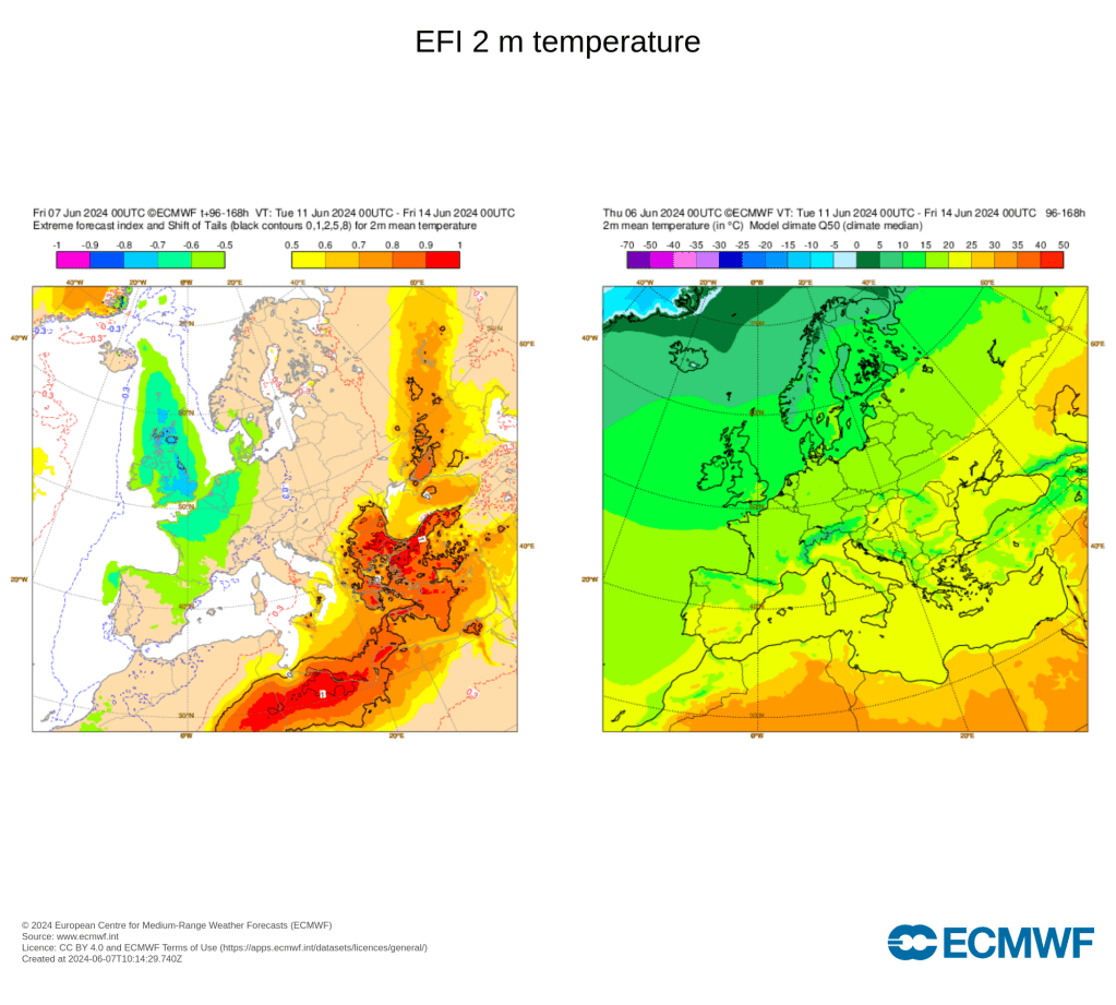 L’indice EFI en milieu de semaine prochaine est assez exceptionnel pour un mois de juin surtout dans le contexte de réchauffement climatique.