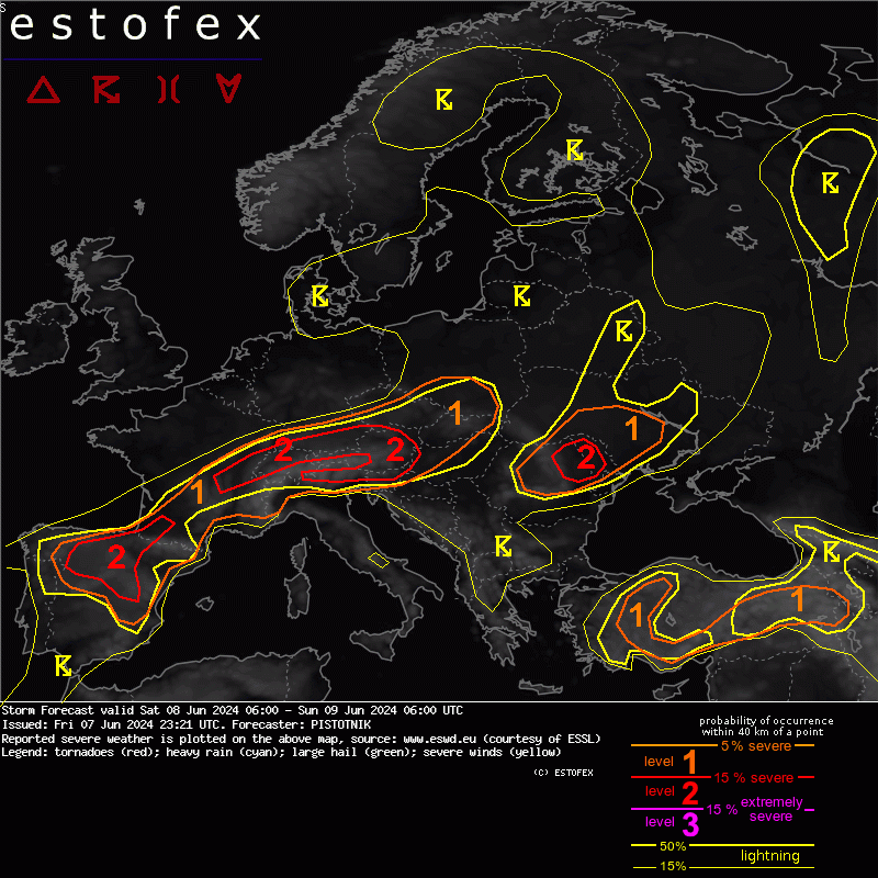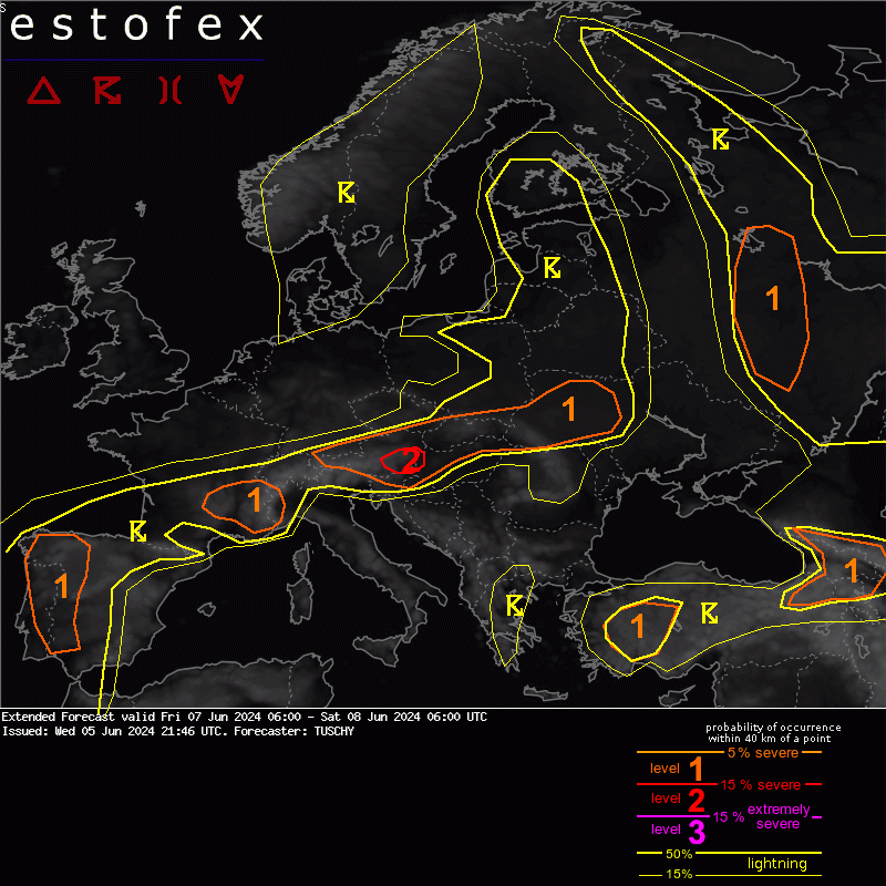 Orages violents à venir en Europe de l’ouest de la Péninsule Ibérique, du centre-est de la France jusqu’en Ukraine en passant par l’Autriche et la Slovaquie.