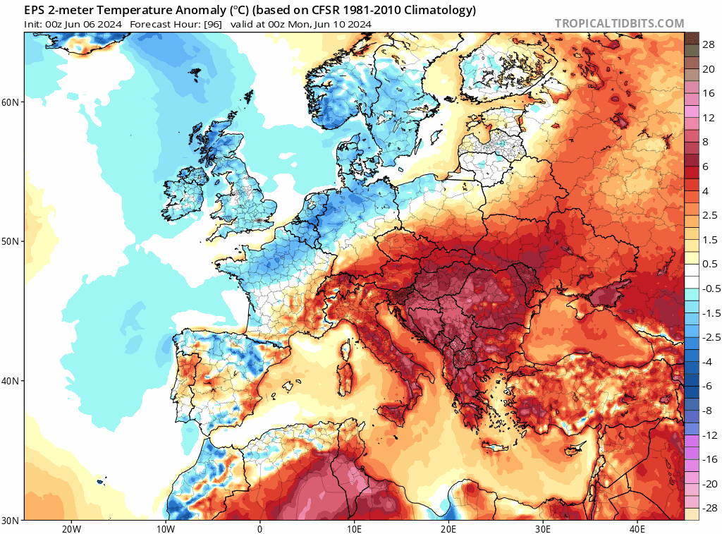 . Anomalie chaude en Europe sauf Iles Britanniques, nord France, nord Allemagne, nord Pologne et Pays Baltes