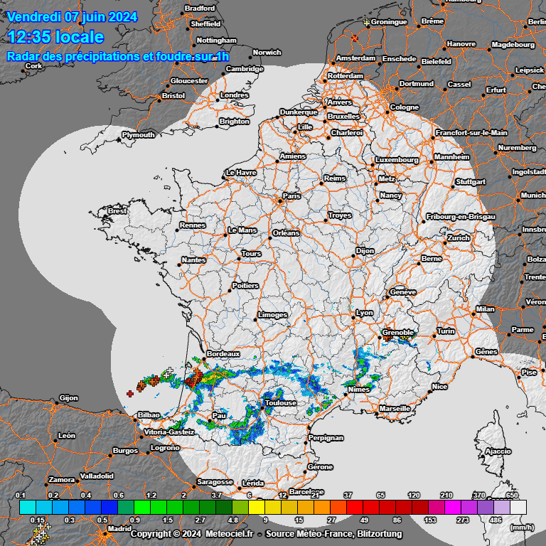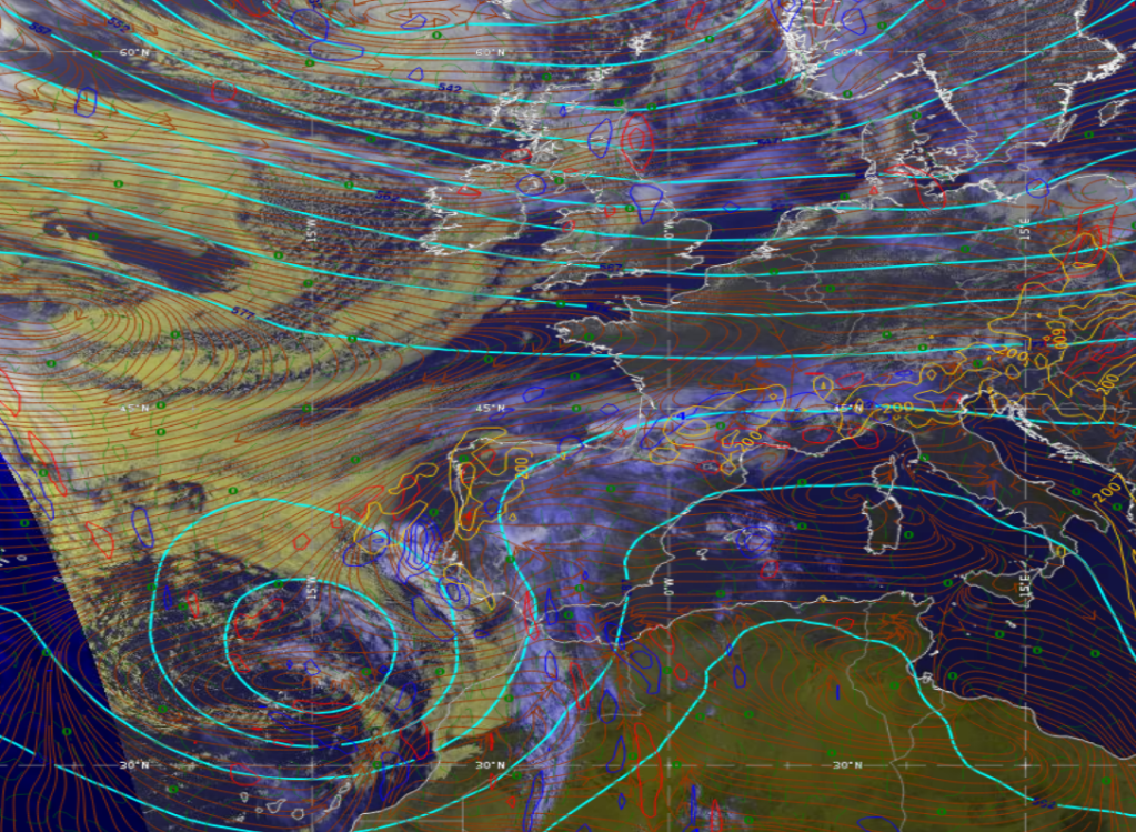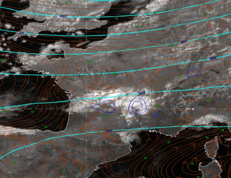 . La goutte froide d’altitude vient se placer sur la Péninsule Ibérique renforçant le cyclonisme et le dynamisme sur la moitié sud du pays. En surface, une dépression devrait se mettre en place graduellement vers le sud-ouest en deuxième partie de journée renforçant là aussi l’occurrence d’orages particulièrement diluviens entre Landes et Hautes Pyrénées, ainsi qu’entre Pyrénées Atlantiques et Gers.