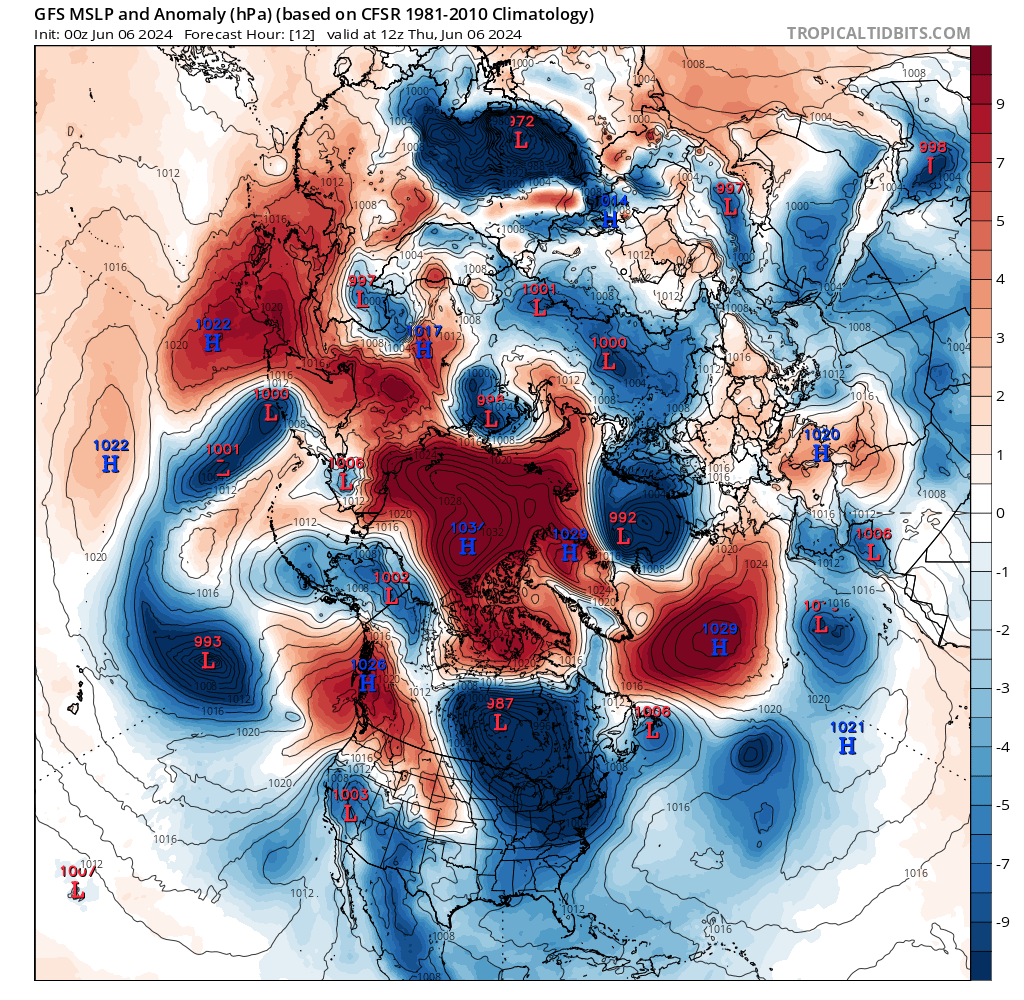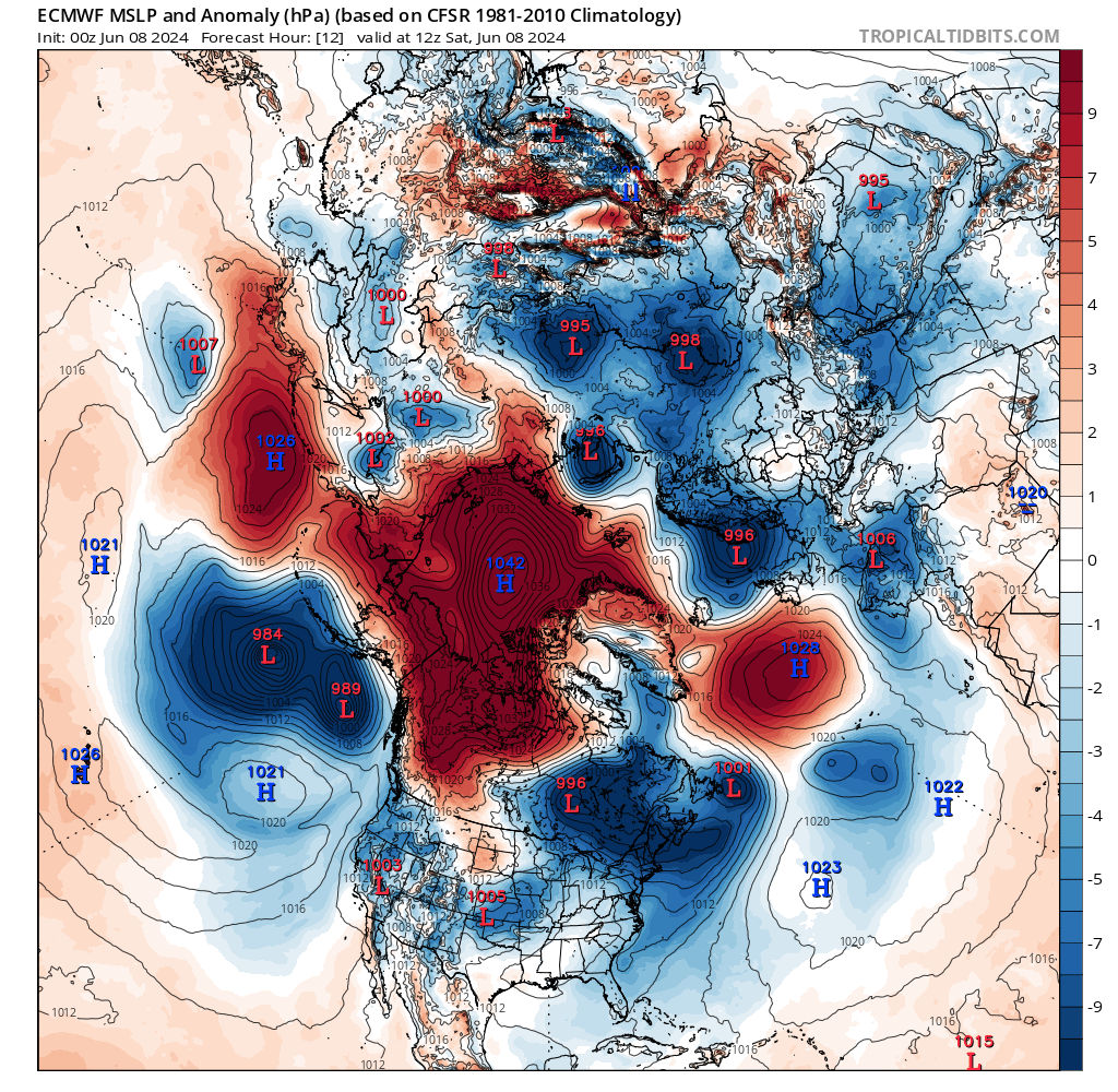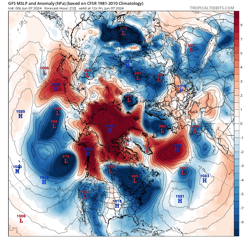 . Basses pressions USA. Basses pressions Canada sauf nord et ouest. Hautes pressions Alaska. Hauts géopotentiels Alaska. Hauts géopotentiels Canada sauf sud / sud-est et extrême nord-est. Hauts géopotentiels USA sauf est et nord.