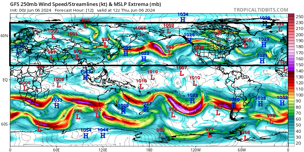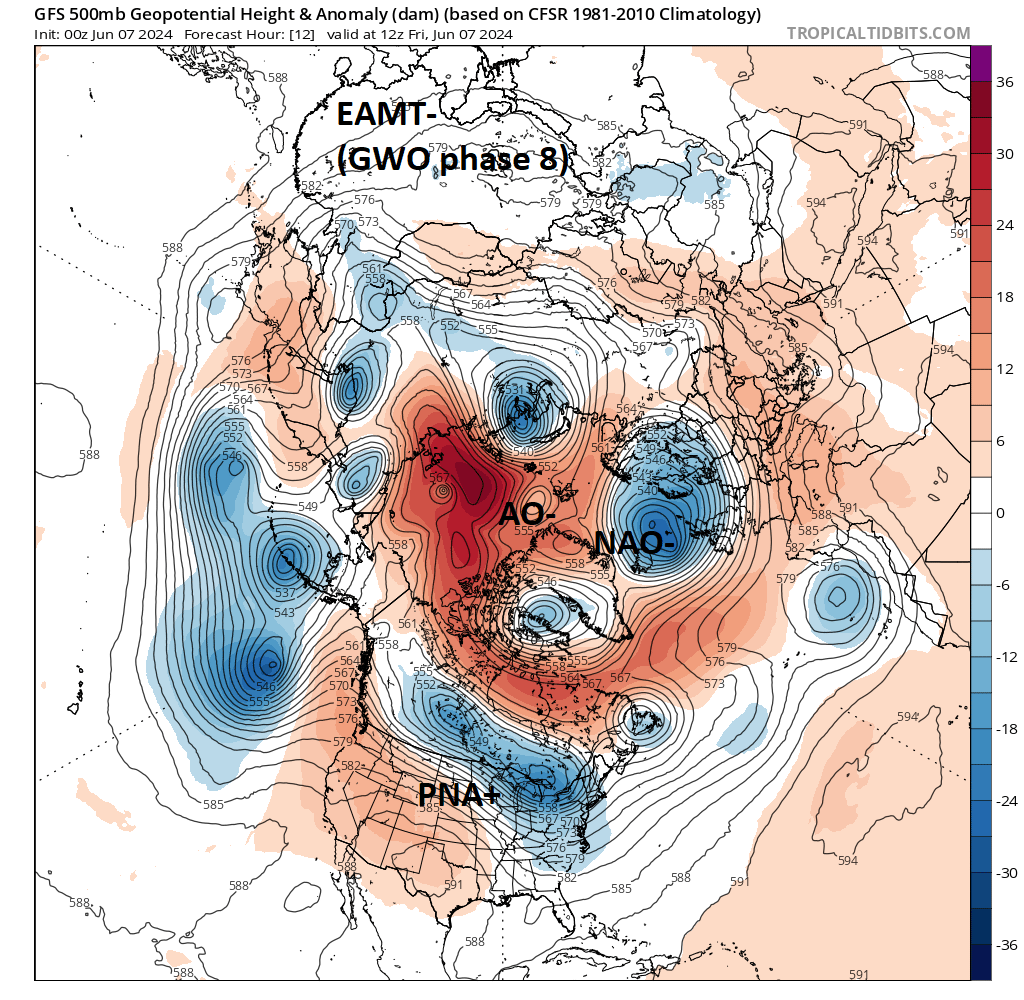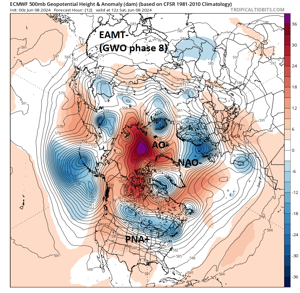 . Schéma redevenant graduellement plus méridien avec un courant jet qui ondule sur le Pacifique. L’effet de la précédente EAMT+ s’estompe.