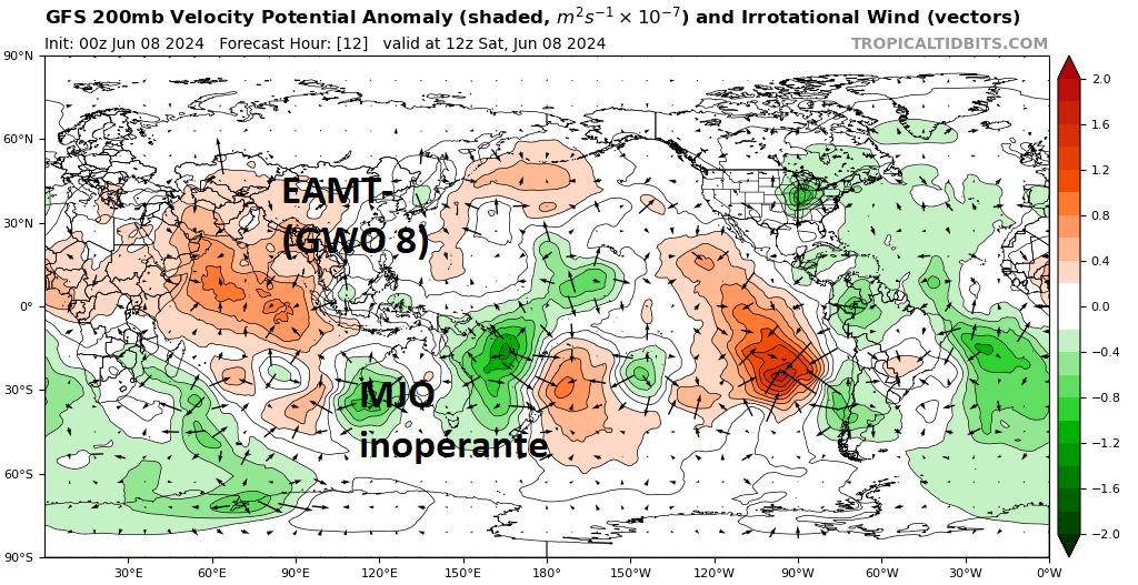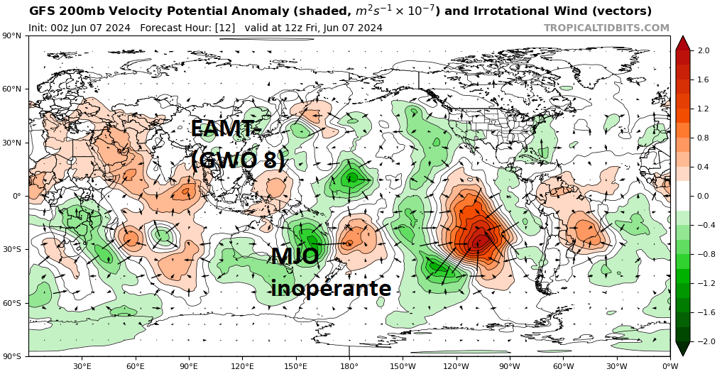Anomalies de vélocité : en vert anomalies favorables à la convection / en orange anomalies défavorables à la convection et plutôt favorables à la subsidence