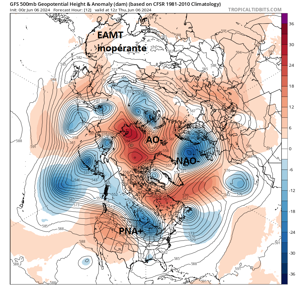 Anomalies de géopotentiels : hauts géopotentiels en orange-rouge / bas géopotentiels en bleus