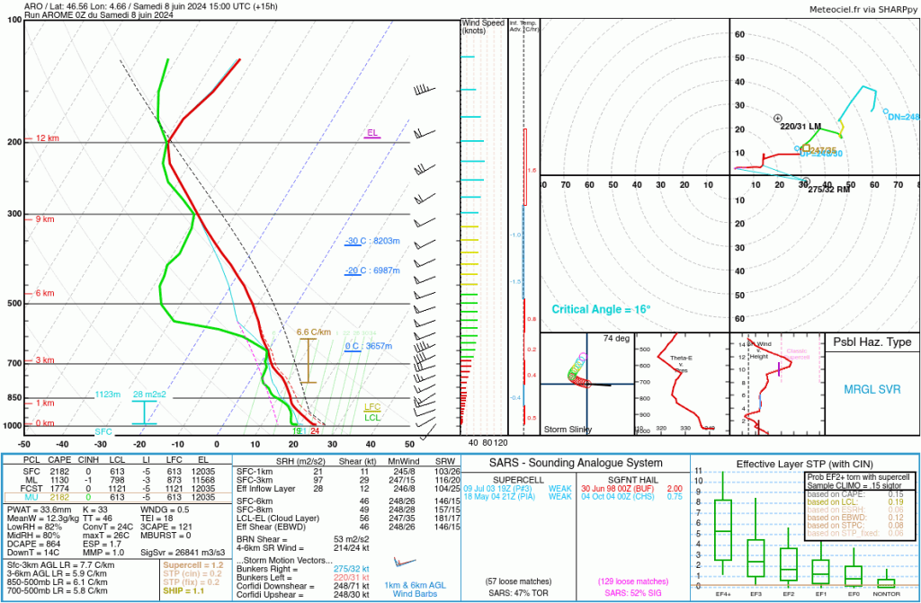 . La goutte froide d’altitude remonte vers le Portugal en injectant des talwegs secondaires au sud de la Loire dans un contexte plus divergent en altitude que la veille. De même, l’instabilité est plus présente à la mi-journée que la veille avec de l’humidité et une lourdeur prégnantes. Les points de rosée atteignent déjà 20°C localement dans le centre-est. La convergence de basses couches est également plus structurée qu’hier. Cisaillements en profondeur équivalents à hier. Tout cela est propice à des orages parfois forts.
