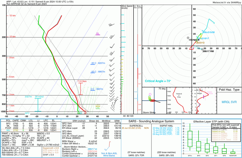 Les radiosondages pour les 4 départements du sud-ouest les plus exposés sont très favorable à des orages très pluvieux pouvant donner plus de 100 mm. La PWAT devrait dépasser les 40 mm et potentiellement les 45 mm. La colonne humide est bien formée malgré une légère intrusion sèche à moyenne altitude. Le risque de micro-rafales semble assez faible tout de même. Instabilité forte pouvant favoriser une bonne activité électrique sous ces orages prenant certainement l’apparence d’un système convectif de méso échelle. Le risque de supercellules semble assez marginal mais pas exclu à l’avant du système.