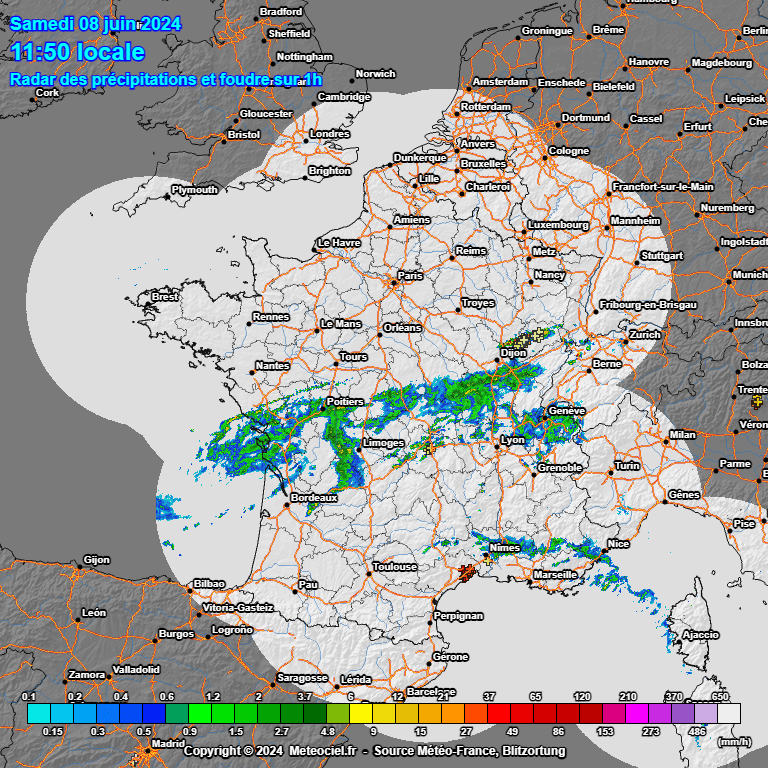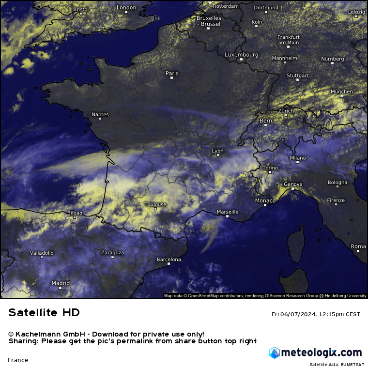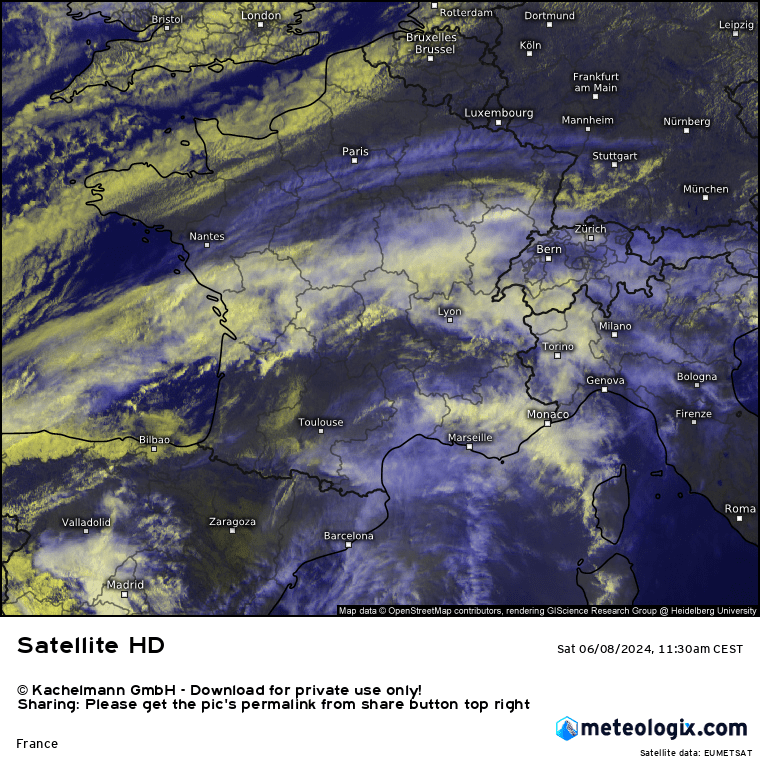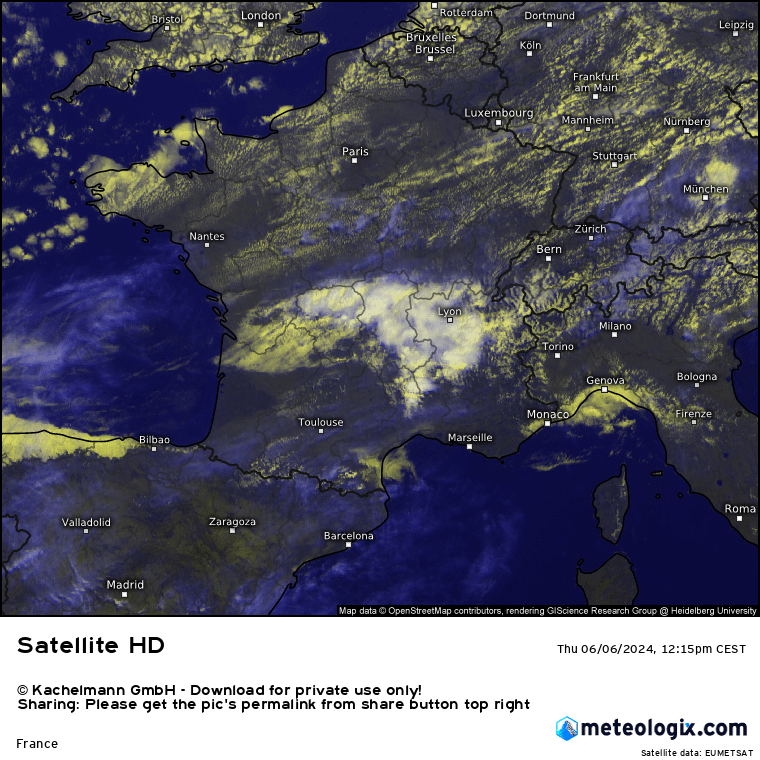. La France est au carrefour des centres d’action avec un flux de sud-ouest plutôt anticyclonique et chaud au sud, et un flux océanique d’ouest frais sur la moitié nord. Cela renforce le contraste thermique sur le pays entre le nord et le sud, contraste qui s’opère du sud-ouest au nord-est. C’est favorable à une tendance orageuse. Des orages d’étage moyen se sont développés en matinée de l’Aquitaine à l’Auvergne donnant de bonnes averses et un peu d’activité électrique. A la mi-journée, l’activité orageuse se calme mais des averses persistent au sein de cet amas instable se décalant vers le centre-est. Quelques orages tendent à reprendre dans l’air chaud et plus instable à l’avant sur l’Isère. Pas mal d’incertitudes sur l’évolution en cours d’après-midi car cet amas instable pourrait inhiber la convection pour plus tard avec une instabilité moindre qu’annoncée. Des orages parfois forts pourraient cependant reprendre en fin d’après-midi par le Massif Central se décalant ensuite vers les Alpes. La divergence d’altitude est bien campée sur le Massif Central avec une convergence de basses couches présente bien que mal dessinée.