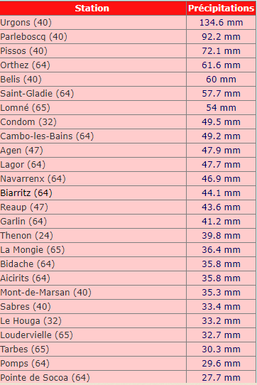 Gros cumuls de pluie localisés ces dernières 24 h sous des orages diluviens notamment entre Landes, Pyrénées Atlantiques, Gers et Hautes Pyrénées. 134,6 mm relevé à Urgons (40). Très localement, les 150 mm ont pu être atteints.