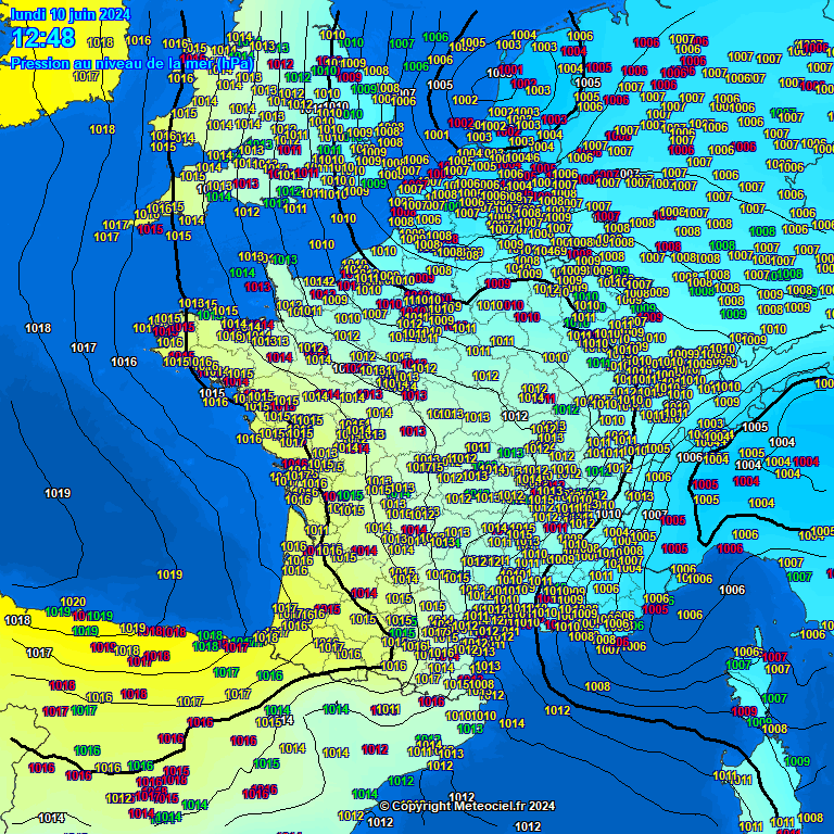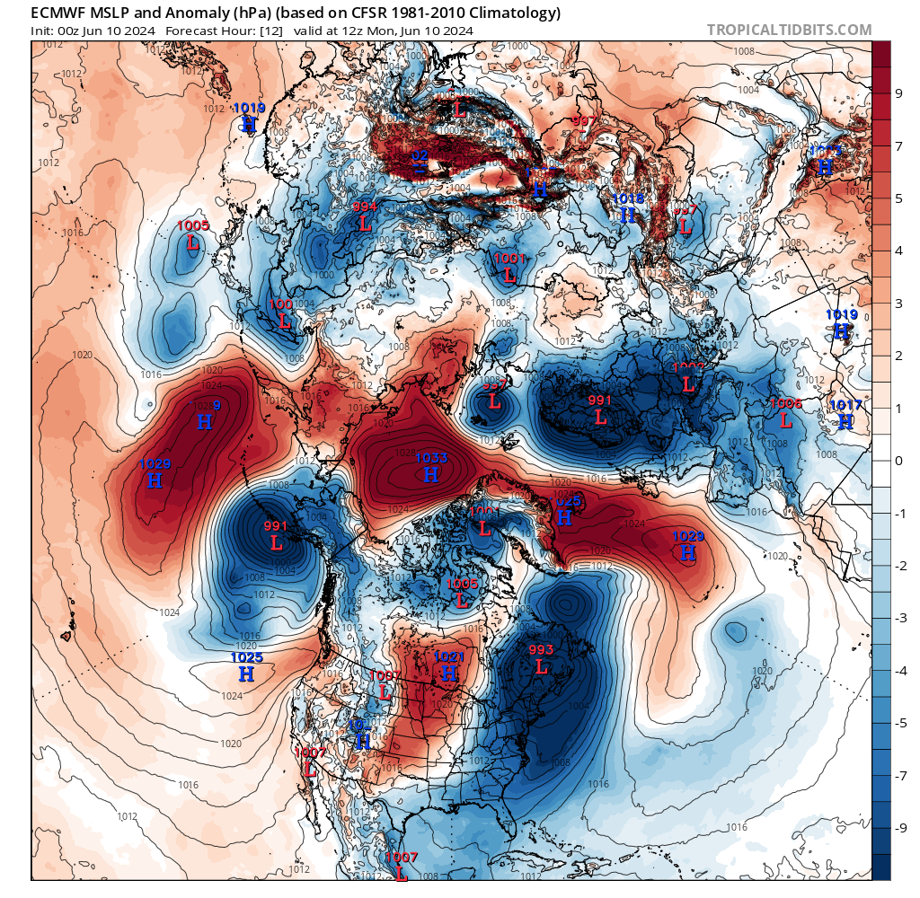 . Hautes pressions USA sauf Rocheuses, sud Californie et moitié est. Basses pressions Canada sauf sud et extrême nord-ouest. Basses pressions Alaska. Hauts géopotentiels Alaska sauf sud-ouest. Hauts géopotentiels Canada sauf est/ sud-est et extrême nord/nord-est. Hauts géopotentiels USA sauf moitié est.