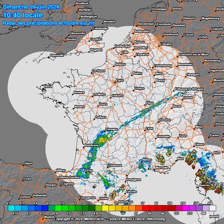 8 800 éclairs relevés en 24 h en France notamment dans le sud-ouest. Source : Keraunos