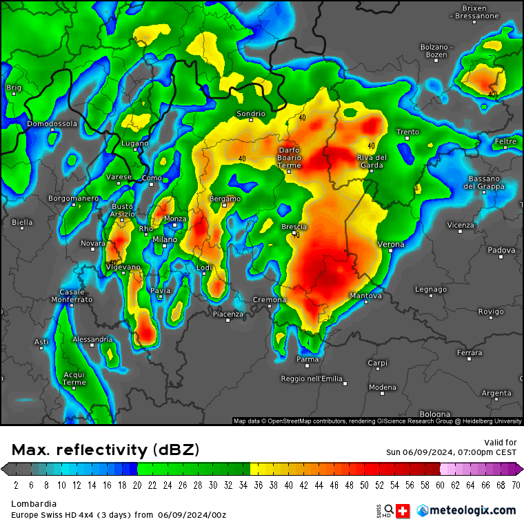 Dégradation orageuse un ton en dessous de ce qui était annoncé pour le nord de l’Italie à cause de la présence de sable saharien qui a inhibé le potentiel de grêle notamment. Des inondations sont tout de même à déplorer.