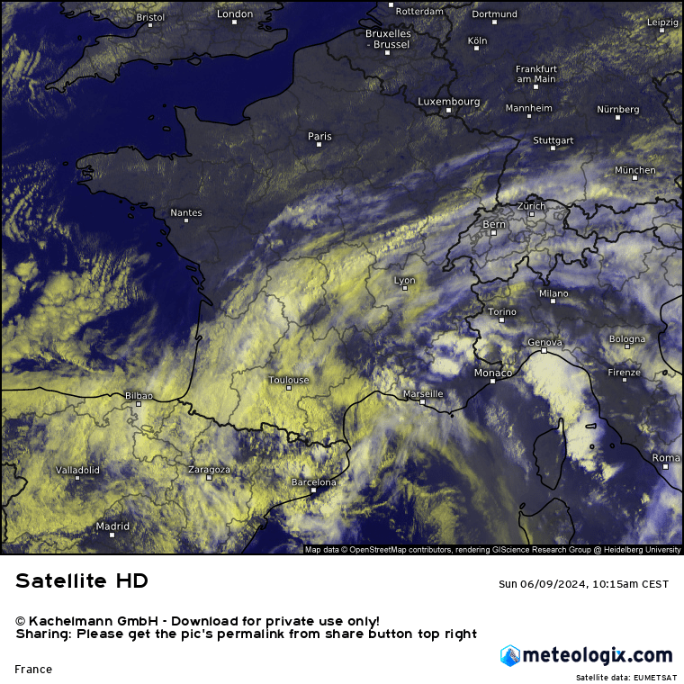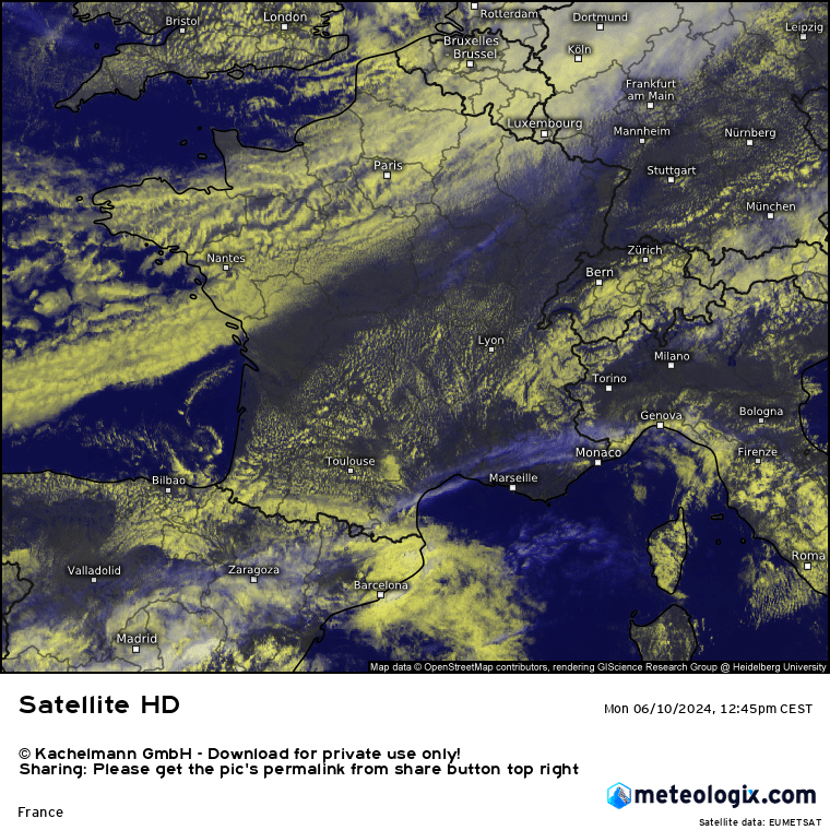 . En altitude, on reste dans un flux d’ouest à nord-ouest mais l’amélioration est en route. On peut s’attendre à quelques averses ou orages cet après-midi sur les Alpes du sud et l’est des Pyrénées. Un front froid circule également au nord de la Loire en étant peu actif et donnant quelques pluies. Ailleurs, c’est le soleil qui s’impose malgré quelques cumulus.