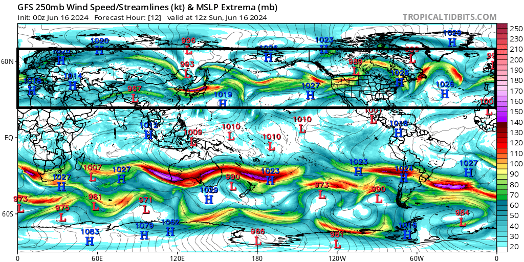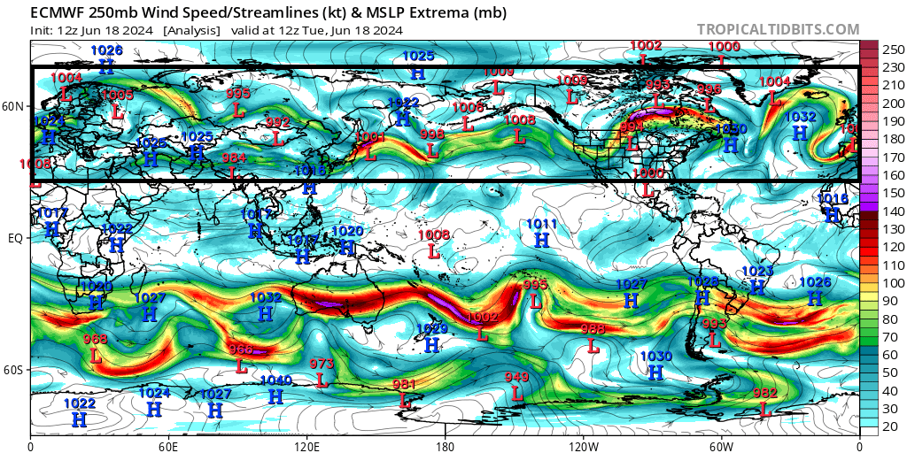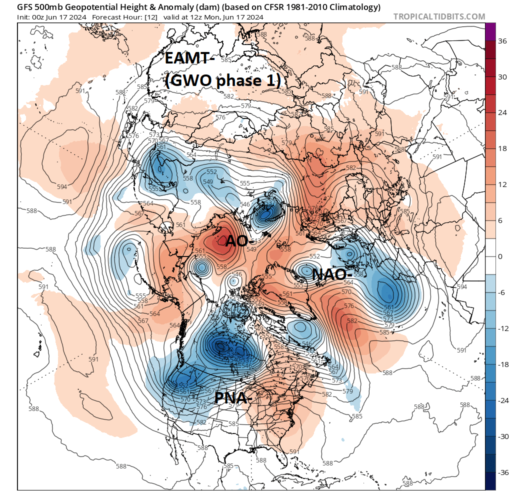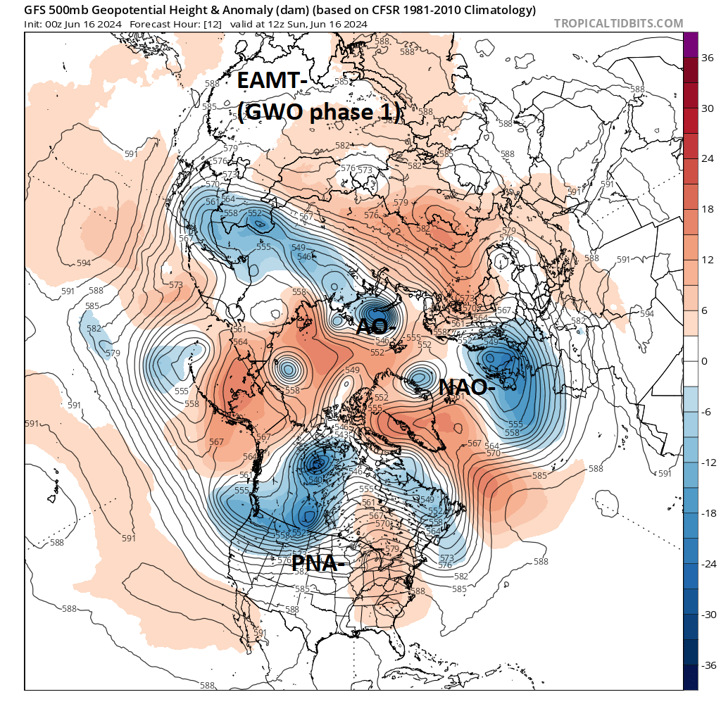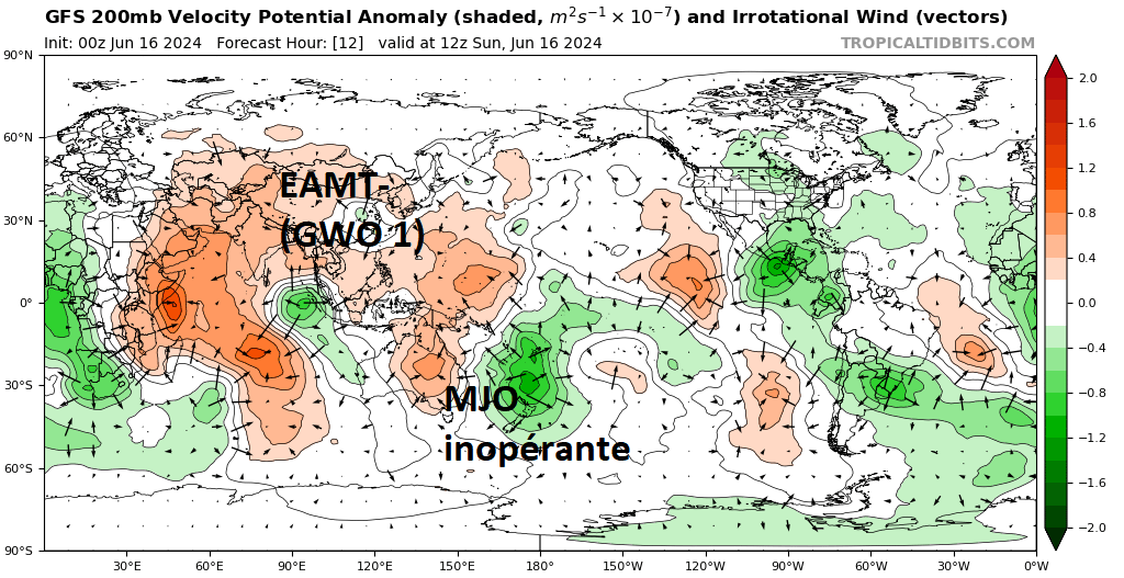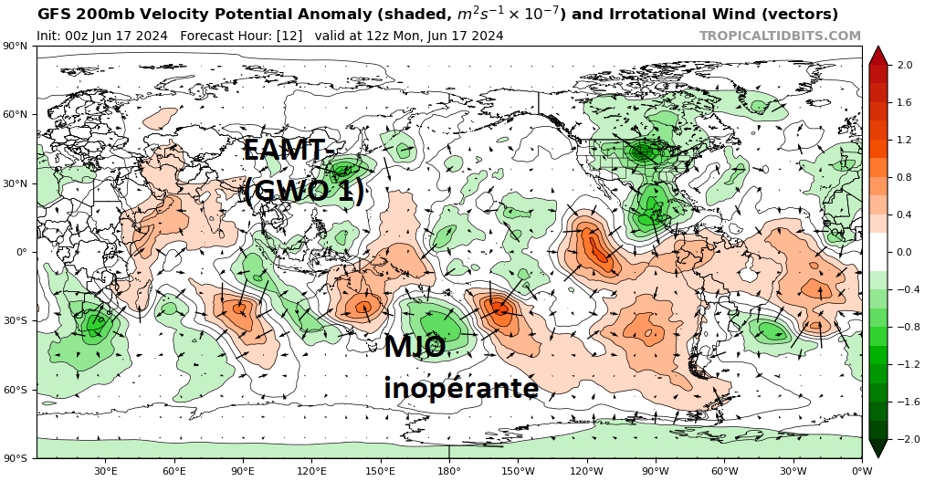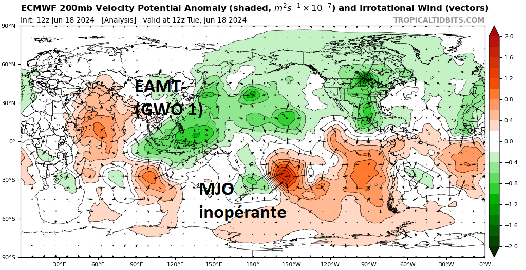 . Schéma général très méridien à plusieurs ondes de Rossby, bloquant de type estival (avec vagues de chaleur dans certains secteurs de l’hémisphère nord, vagues orageuses sur plaines du nord des USA et Europe de l’ouest (France))