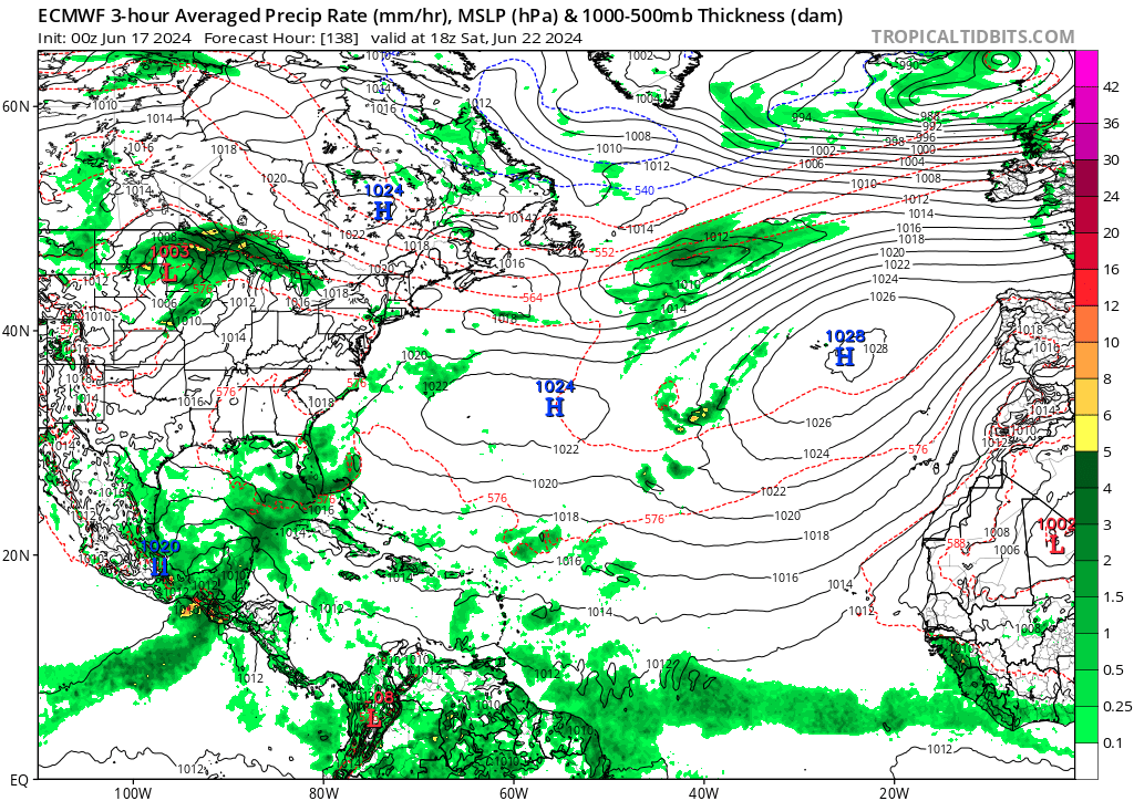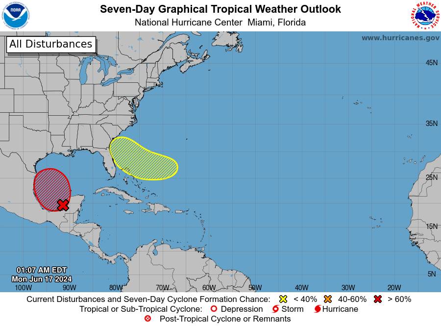 Activité des ondes tropicales sur l’ouest du Golfe du Mexique et l’extrême est du Pacifique sous surveillance en raison du passage d’une onde de Kelvin. Des systèmes cycloniques tropicaux peuvent se former d’ici 7 jours venant possiblement donnant des pluies torrentielles au Guatemala et au Mexique.