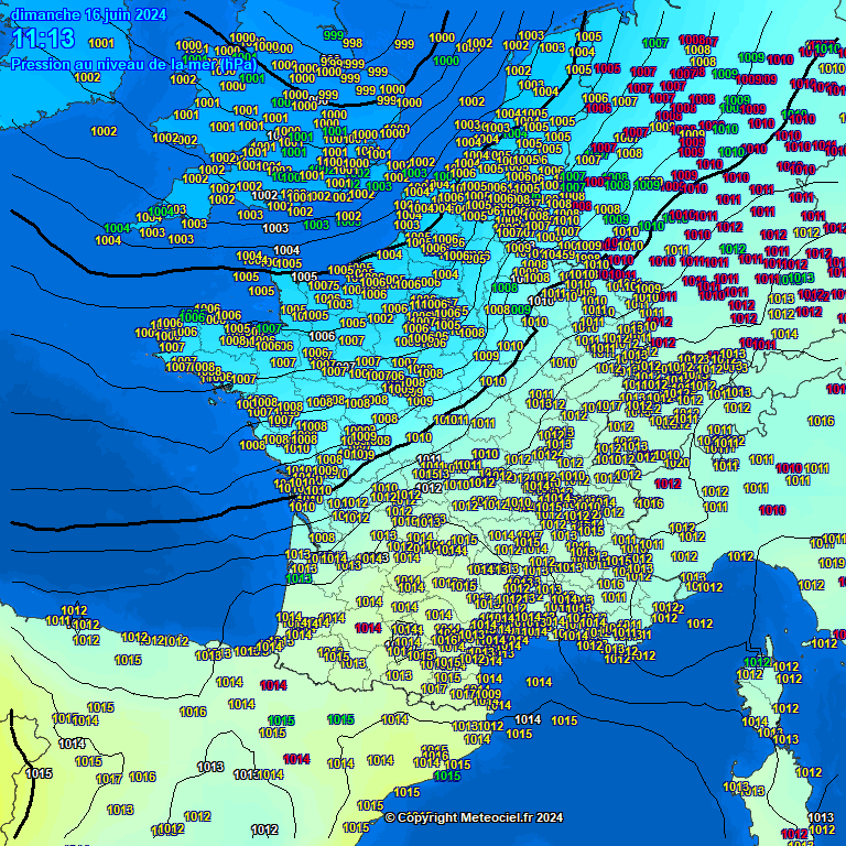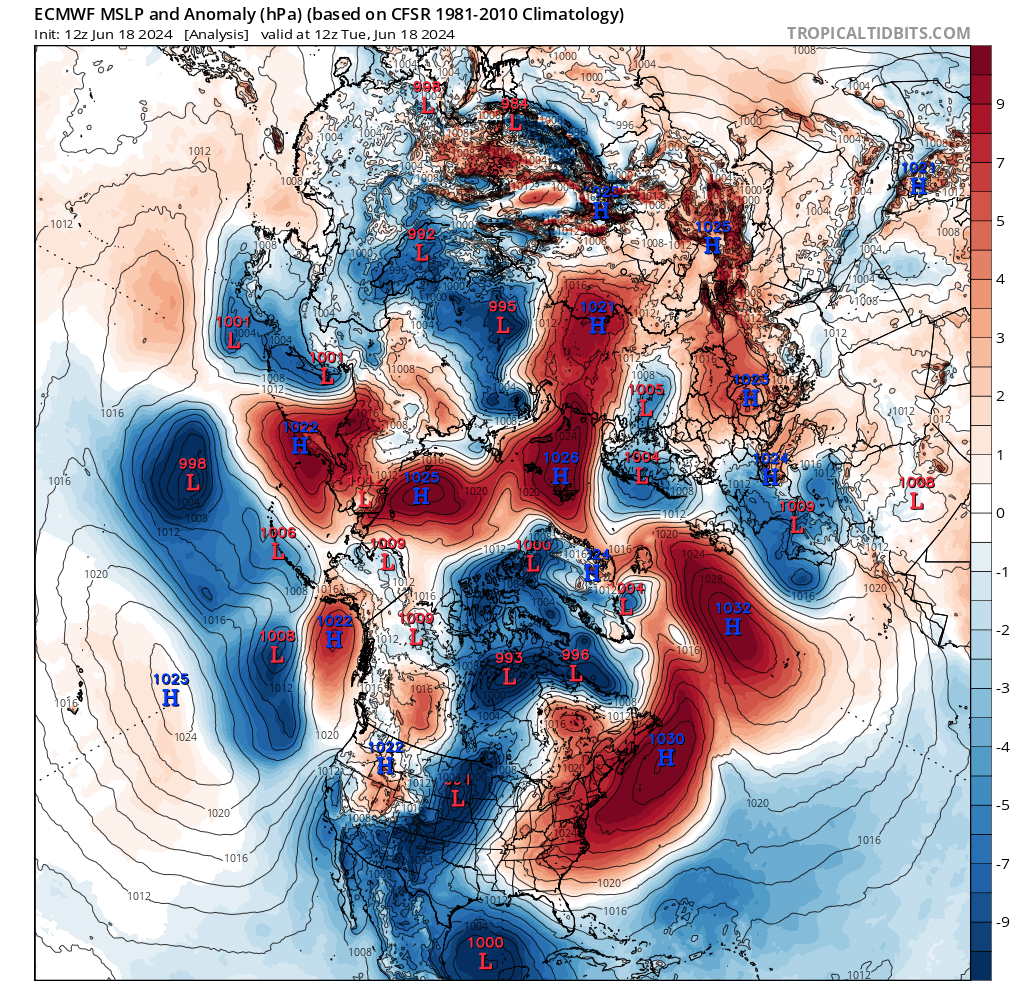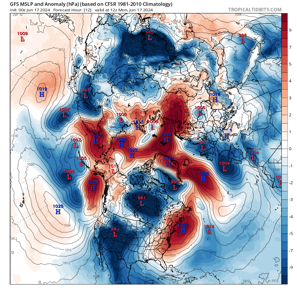 . Basses pressions USA sauf façade est et extrême nord-ouest. Basses pressions Canada sauf est/sud-est et sud-ouest. Basses pressions Alaska. Hauts géopotentiels Alaska. Bas géopotentiels Canada sauf extrême nord-ouest et moitié est. Hauts géopotentiels USA moitié est, bas géopotentiels ailleurs