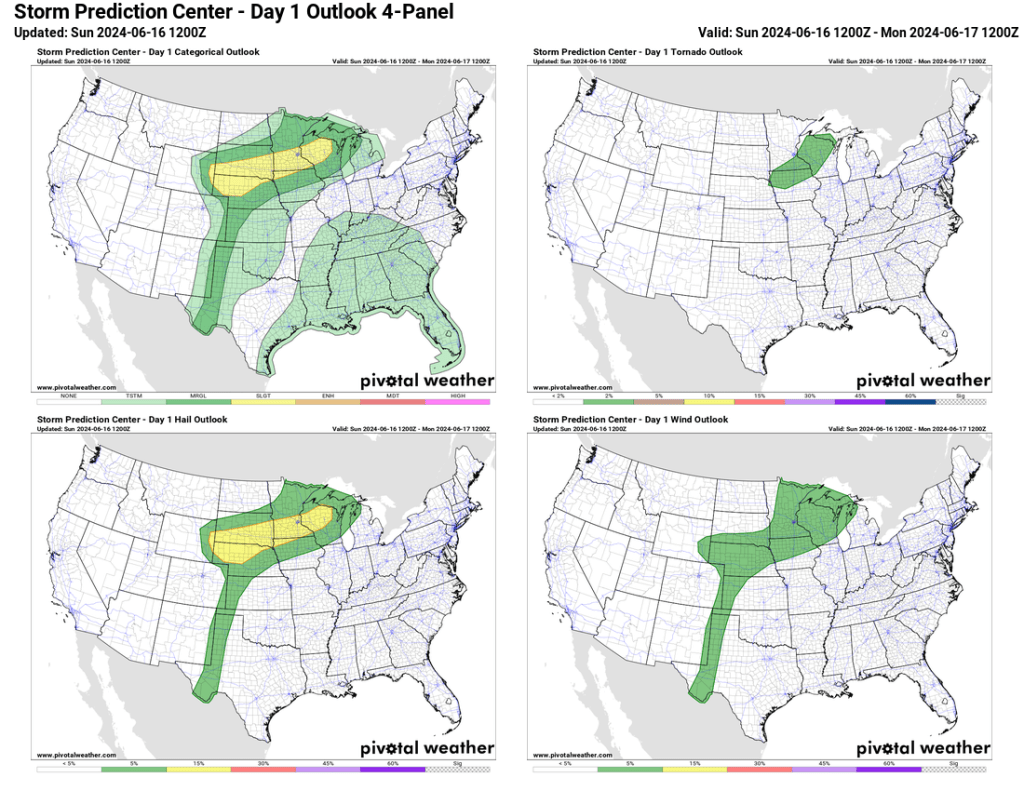 Risque d’orages violents à venir sur les plaines du nord s’étirant au Midwest. Risque tornadique évalué à 5% sur le sud-ouest du Nebraska.