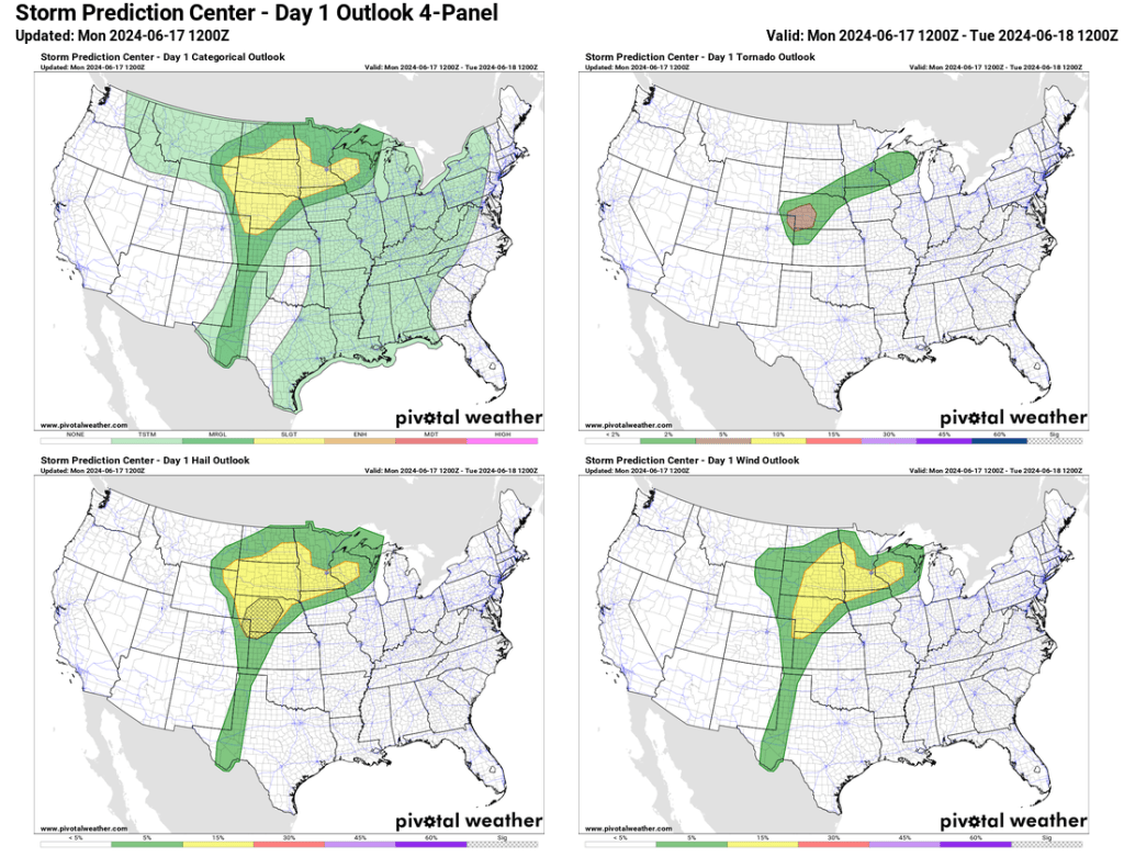 Risque d’orages violents de nouveau entre Nebraska, Dakota du sud, Iowa, Minnesota et Wisconsin. Risque tornadique évalué à 2%.