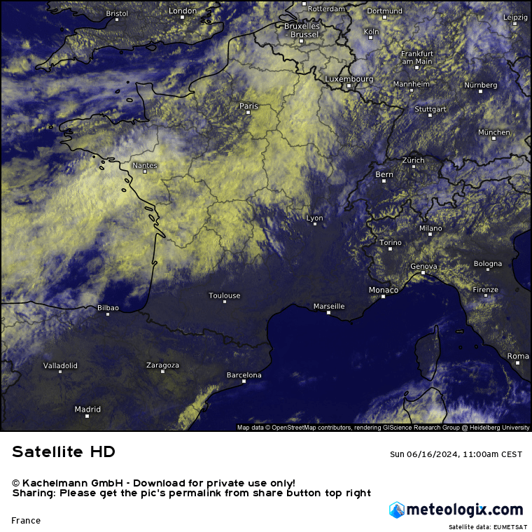 Ciel dégagé de l’extrême sud-ouest à l’extrême sud-est, Corse comprise sauf entrées maritimes près du Golfe du Lion.