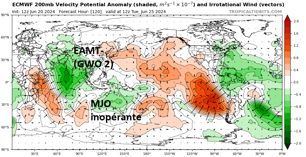 . EAMT- GWO phase 2 (AAM-) : favorise un courant jet plus amplifié à la latitude environ 35 nord de l’Océan Indien nord.