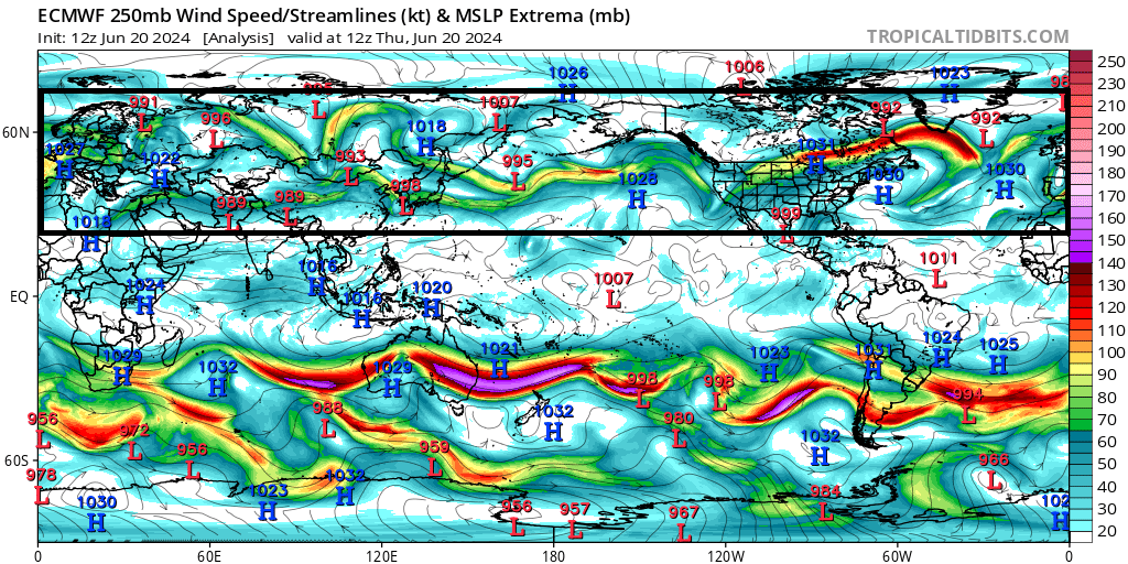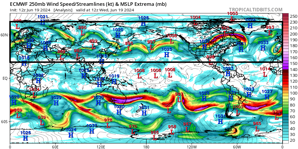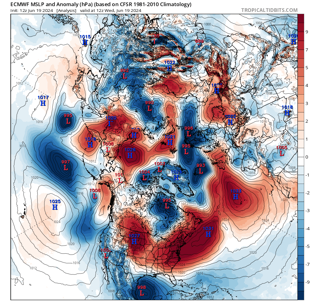 . Hautes pressions USA sauf façade ouest et extrême sud. Hautes pressions Canada sauf baie d’Hudson et nord. Basses pressions Alaska. Hauts géopotentiels Alaska. Bas géopotentiels Canada sauf nord-ouest et moitié est. Hauts géopotentiels USA moitié est, bas géopotentiels ailleurs