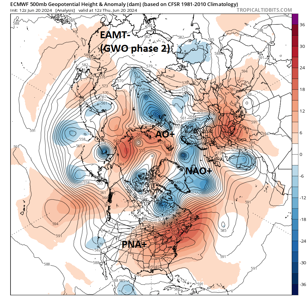 . PNA+ (Bas géopotentiels/basses pressions au large des Aléoutiennes – hauts géopotentiels /hautes pressions dominantes descendant sur les Rocheuses)