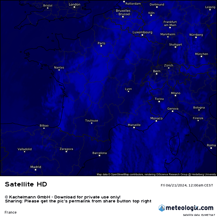 . Une nouvelle goutte froide vient réalimenter le précédent talweg sur le nord de la France. Un front froid en voie de frontolyse traverse le pays en donnant des pluies dans le sud-ouest, et des averses et/ou orages plus à l’est jusqu’au nord-est. A l’arrière, un ciel de traine avec des éclaircies s’installe sur un gros quart nord-ouest. Ciel plus dégagé sur PACA et entièrement dégagé en Corse.