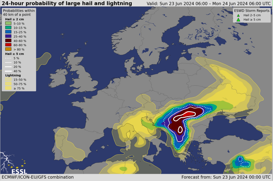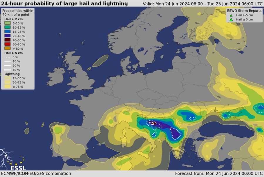Orages gréligènes supercellulaires en Italie du nord donnant de la grosse grêle jusqu’à 7 cm de diamètre et une tornade près d’Alexandrie.
