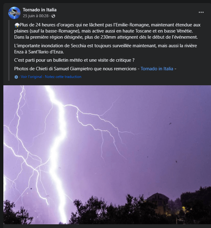 De fortes pluies orageuses persistent depuis la nuit sur les reliefs du Vicentin, du bas Trentin Alto Adige et du lac de Garde avec des accumulations locales de plus de 100mm. Plusieurs inondations et glissements de terrain ont été signalés dans la région, donc soyez prudents. Source : Tornado in Italia